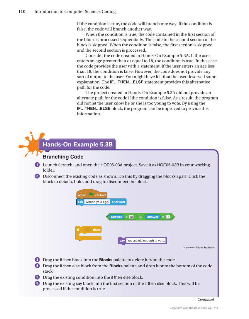 If the condition is true, the code will branch one way. If the condition is false, the code will branch another way. When the condition is true, the code contained in the first section of the block is processed sequentially. The code in the second section of the block is skipped. When the condition is false, the first section is skipped, and the second section is processed. Consider the code created in Hands-On Example 5-3A. If the user enters an age greater than or equal to 18, the condition is true. In this case, the code provides the user with a statement. If the user enters an age less than 18, the condition is false. However, the code does not provide any sort of output to the user. You might have felt that the user deserved some explanation. The IF…THEN…ELSE statement provides this alternative path for the code. The project created in Hands-On Example 5.3A did not provide an alternate path for the code if the condition is false. As a result, the program did not let the user know he or she is too young to vote. By using the IF…THEN…ELSE block, the program can be improved to provide this information. Hands-On Example 5.3B Hands-On Example 5.3B Branching Code C 1 Launch Scratch, , and open the HOE05-03A projec ct . Save it as HOE05-03B in your working folder. 2 Disconnect the existing code as shown. Do this b by dragging the blocks apart. Click the block to detach, , hold, and drag to disconnect the e block. when clicked ask What is your age? and wait or answer 18 answer = 18 if then say You are old enough to vote. Goodheart-Willcox Publisher 3 Drag the if then block b into the Blocks palette to d de lete it from the code. 4 Drag the if then e el se block from the Blocks palett te and drop it onto the bottom of the code stack. 5 Drag the existin ng condition into the if then else bl lo ck. 6 Drag the existin ng say block into the first section o of the if then else block. This will be processed if the condition is true. Continued Copyright Goodheart-Willcox Co., Inc. 110 Introduction to Computer Science: Coding