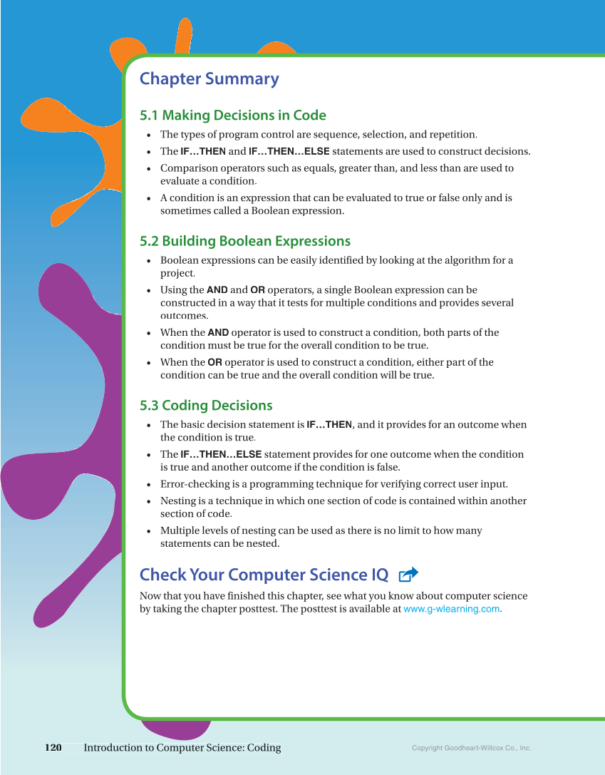 Chapter Summary 5.1 Making Decisions in Code • The types of program control are sequence, selection, and repetition. • The IF…THEN and IF…THEN…ELSE statements are used to construct decisions. • Comparison operators such as equals, greater than, and less than are used to evaluate a condition. • A condition is an expression that can be evaluated to true or false only and is sometimes called a Boolean expression. 5.2 Building Boolean Expressions • Boolean expressions can be easily identified by looking at the algorithm for a project. • Using the AND and OR operators, a single Boolean expression can be constructed in a way that it tests for multiple conditions and provides several outcomes. • When the AND operator is used to construct a condition, both parts of the condition must be true for the overall condition to be true. • When the OR operator is used to construct a condition, either part of the condition can be true and the overall condition will be true. 5.3 Coding Decisions • The basic decision statement is IF…THEN, and it provides for an outcome when the condition is true. • The IF…THEN…ELSE statement provides for one outcome when the condition is true and another outcome if the condition is false. • Error-checking is a programming technique for verifying correct user input. • Nesting is a technique in which one section of code is contained within another section of code. • Multiple levels of nesting can be used as there is no limit to how many statements can be nested. Check Your Computer Science IQ Now that you have finished this chapter, see what you know about computer science by taking the chapter posttest. The posttest is available at www.g-wlearning.com. 120 Introduction to Computer Science: Coding Copyright Goodheart-Willcox Co., Inc.
