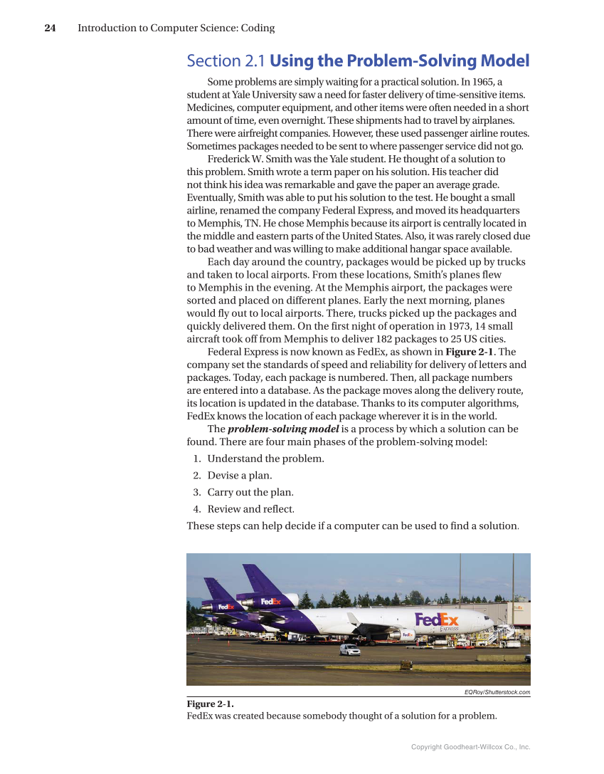 Section 2.1 Using the Problem-Solving Model Some problems are simply waiting for a practical solution. In 1965, a student at Yale University saw a need for faster delivery of time-sensitive items. d Medicines, computer equipment, and other items were often needed in a short amount of time, even overnight. These shipments had to travel by airplanes. There were airfreight companies. However, these used passenger airline routes. Sometimes packages needed to be sent to where passenger service did not go. Frederick W. Smith was the Yale student. He thought of a solution to this problem. Smith wrote a term paper on his solution. His teacher did not think his idea was remarkable and gave the paper an average grade. Eventually, Smith was able to put his solution to the test. He bought a small airline, renamed the company Federal Express, and moved its headquarters to Memphis, TN. He chose Memphis because its airport is centrally located in the middle and eastern parts of the United States. Also, it was rarely closed due to bad weather and was willing to make additional hangar space available. Each day around the country, packages would be picked up by trucks and taken to local airports. From these locations, Smith’s planes flew to Memphis in the evening. At the Memphis airport, the packages were sorted and placed on different planes. Early the next morning, planes would fly out to local airports. There, trucks picked up the packages and quickly delivered them. On the first night of operation in 1973, 14 small aircraft took off from Memphis to deliver 182 packages to 25 US cities. Federal Express is now known as FedEx, as shown in Figure 2-1. The company set the standards of speed and reliability for delivery of letters and packages. Today, each package is numbered. Then, all package numbers are entered into a database. As the package moves along the delivery route, its location is updated in the database. Thanks to its computer algorithms, FedEx knows the location of each package wherever it is in the world. The problem-solving model is a process by which a solution can be l found. There are four main phases of the problem-solving model: 1. Understand the problem. 2. Devise a plan. 3. Carry out the plan. 4. Review and reflect. These steps can help decide if a computer can be used to find a solution. EQRoy/Shutterstock.com Figure 2-1. FedEx was created because somebody thought of a solution for a problem. Copyright Goodheart-Willcox Co., Inc. 24 Introduction to Computer Science: Coding