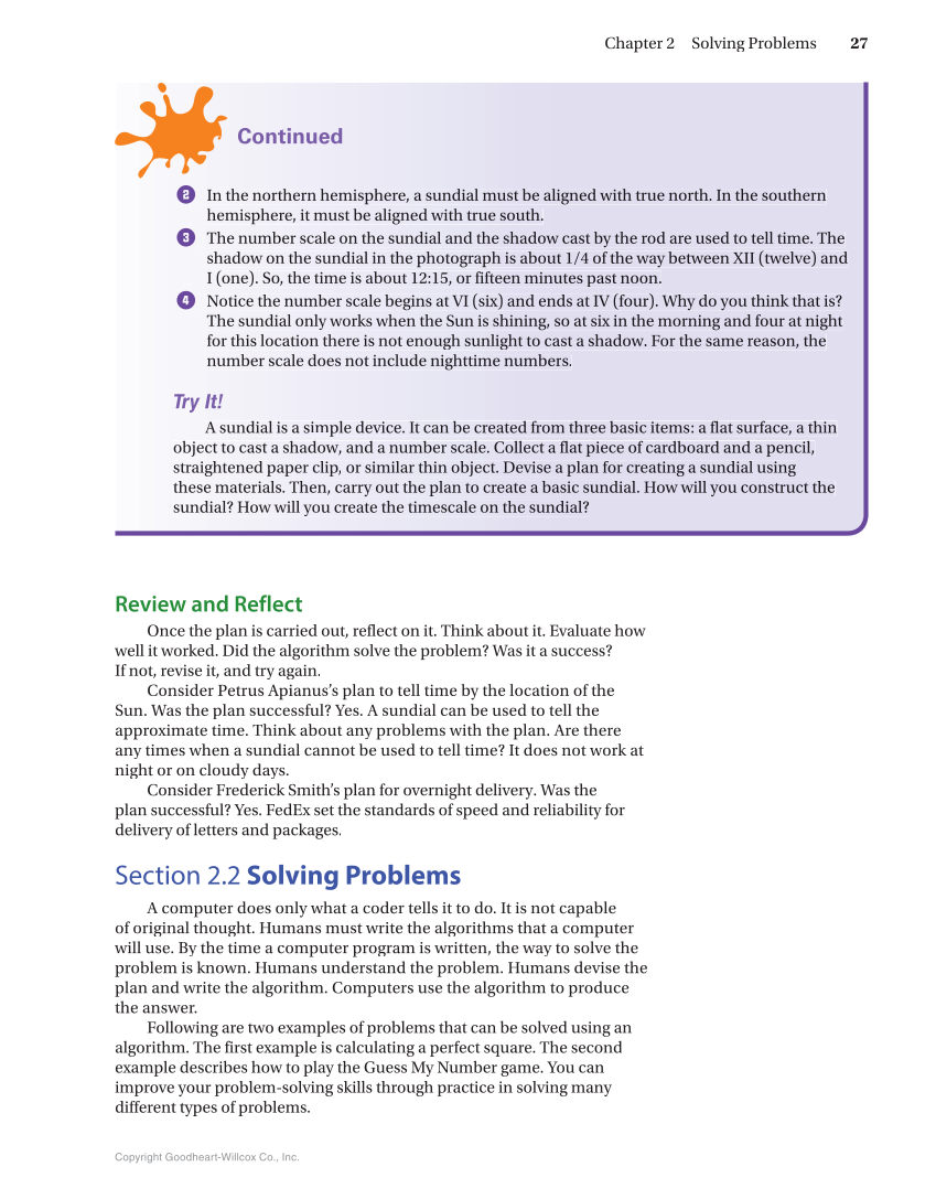 Continued 2 In the northern hemisphere, a sundial must be aligned with true north. In the southern hemisphere, it must m be aligned with true south. 3 The number sca al e on the sundial and the shadow w cast by the rod are used to tell time. The shadow on the s su ndial in the photograph is abou ut 1/4 of the way between XII (twelve) and I (one). So, the time is about 12:15, or fifteen minutes n past noon. 4 Notice the number b scale begins at VI (six) and ends n at IV (four). Why do you think that is? The sundial only y works when the Sun is shining, so at six in the morning and four at night for this location there is not enough sunlight to cast a shadow. For the same reason, the number scale do oe s not include nighttime numbe er s. Try It! A sundial is a simple m device. It can be created from m three basic items: a flat surface, a thin object to cast a shadow, o and a number scale. Collect a a flat piece of cardboard and a pencil, straightened paper clip, c or similar thin object. Devise a plan for creating a sundial using these materials. Then n, carry out the plan to create a basic sundial. How will you construct the sundial? How will you o create the timescale on the sun nd ial? Review and Reflect Once the plan is carried out, reflect on it. Think about it. Evaluate how well it worked. Did the algorithm solve the problem? Was it a success? If not, revise it, and try again. Consider Petrus Apianus’s plan to tell time by the location of the Sun. Was the plan successful? Yes. A sundial can be used to tell the approximate time. Think about any problems with the plan. Are there any times when a sundial cannot be used to tell time? It does not work at night or on cloudy days. Consider Frederick Smith’s plan for overnight delivery. Was the plan successful? Yes. FedEx set the standards of speed and reliability for delivery of letters and packages. Section 2.2 Solving Problems A computer does only what a coder tells it to do. It is not capable of original thought. Humans must write the algorithms that a computer will use. By the time a computer program is written, the way to solve the problem is known. Humans understand the problem. Humans devise the plan and write the algorithm. Computers use the algorithm to produce the answer. Following are two examples of problems that can be solved using an algorithm. The first example is calculating a perfect square. The second example describes how to play the Guess My Number game. You can improve your problem-solving skills through practice in solving many different types of problems. Copyright Goodheart-Willcox Co., Inc. Chapter 2 Solving Problems 27