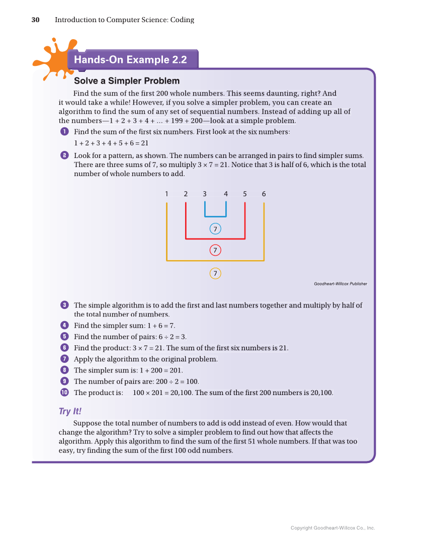 Hands-On Example 2.2 Hands-On Example 2.2 Solve a Simpler Problem Find the sum of f the first 200 whole numbers. This T seems daunting, right? And it would take a while e! However, if you solve a simpler problem, you can create an algorithm to find the sum of any set of sequential numbers. n Instead of adding up all of the numbers—1 + 2 + 3 + 4 + … + 199 + 200—look at t a simple problem. 1 Find the sum of f the first six numbers. First look at a the six numbers: 1 + 2 + 3 + 4 + 5 + + 6 = 21 2 Look for a pattern, r as shown. The numbers can be b arranged in pairs to find simpler sums. There are three sums of 7, so multiply 3 × 7 = 21. Notice that 3 is half of 6, which is the total number of whole l numbers to add. 1 2 3 4 5 6 7 7 7 Goodheart-Willcox Publisher 3 The simple algorithm o is to add the first and last numbers n together and multiply by half of the total numbe er of numbers. 4 Find the simpler r sum: 1 + 6 = 7. 5 Find the numbe er of pairs: 6 ÷ 2 = 3. 6 Find the product: c 3 × 7 = 21. The sum of the first s si x numbers is 21. 7 Apply the algori it hm to the original problem. 8 The simpler sum m is: 1 + 200 = 201. 9 The number of pairs p are: 200 ÷ 2 = 100. 0 The product is: 100 × 201 = 20,100. The sum of f the first 200 numbers is 20,100. Try It! Suppose the total a number of numbers to add is o od d instead of even. How would that change the algorithm? m Try to solve a simpler problem m to find out how that affects the algorithm. Apply this s algorithm to find the sum of the e first 51 whole numbers. If that was too easy, try finding the s su m of the first 100 odd numbers. s Copyright Goodheart-Willcox Co., Inc. 30 Introduction to Computer Science: Coding
