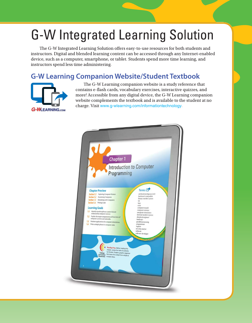 G-W Integrated Learning Solution The G-W Integrated Learning Solution offers easy-to-use resources for both students and instructors. Digital and blended learning content can be accessed through any Internet-enabled device, such as a computer, smartphone, or tablet. Students spend more time learning, and instructors spend less time administering. G-W Learning Companion Website/Student Textbook The G-W Learning companion website is a study reference that contains e-flash cards, vocabulary exercises, interactive quizzes, and more! Accessible from any digital device, the G-W Learning companion website complements the textbook and is available to the student at no charge. Visit www.g-wlearning.com/informationtechnology.