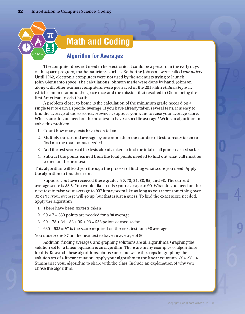 Math and Coding The computer does not need to be electronic. It could be a person. In the early days of the space program, mathematicians, such as Katherine Johnson, were called computers. Until 1962, electronic computers were not used by the scientists trying to launch John Glenn into space. The calculations Johnson made were done by hand. Johnson, along with other women computers, were portrayed in the 2016 film Hidden Figures, which centered around the space race and the mission that resulted in Glenn being the first American to orbit Earth. A problem closer to home is the calculation of the minimum grade needed on a single test to earn a specific average. If you have already taken several tests, it is easy to find the average of those scores. However, suppose you want to raise your average score. What score do you need on the next test to have a specific average? Write an algorithm to solve this problem: 1. Count how many tests have been taken. 2. Multiply the desired average by one more than the number of tests already taken to find out the total points needed. 3. Add the test scores of the tests already taken to find the total of all points earned so far. 4. Subtract the points earned from the total points needed to find out what still must be scored on the next test. This algorithm will lead you through the process of finding what score you need. Apply the algorithm to find the score. Suppose you have received these grades: 90, 78, 84, 88, 95, and 98. The current average score is 88.8. You would like to raise your average to 90. What do you need on the next test to raise your average to 90? It may seem like as long as you score something over 92 or 93, your average will go up, but that is just a guess. To find the exact score needed, apply the algorithm. 1. There have been six tests taken. 2. 90 × 7 = 630 points are needed for a 90 average. 3. 90 + 78 + 84 + 88 + 95 + 98 = 533 points earned so far. 4. 630 – 533 = 97 is the score required on the next test for a 90 average. You must score 97 on the next test to have an average of 90. Addition, finding averages, and graphing solutions are all algorithms. Graphing the solution set for a linear equation is an algorithm. There are many examples of algorithms for this. Research these algorithms, choose one, and write the steps for graphing the solution set of a linear equation. Apply your algorithm to the linear equation 3X + 2Y = 6. Summarize your algorithm to share with the class. Include an explanation of why you chose the algorithm. Algorithm for Averages Copyright Goodheart-Willcox Co., Inc. 32 32 Introduction In tr od uc ti on to t o Computer Co mp ut er Science: S ci en ce : Coding Co di ng