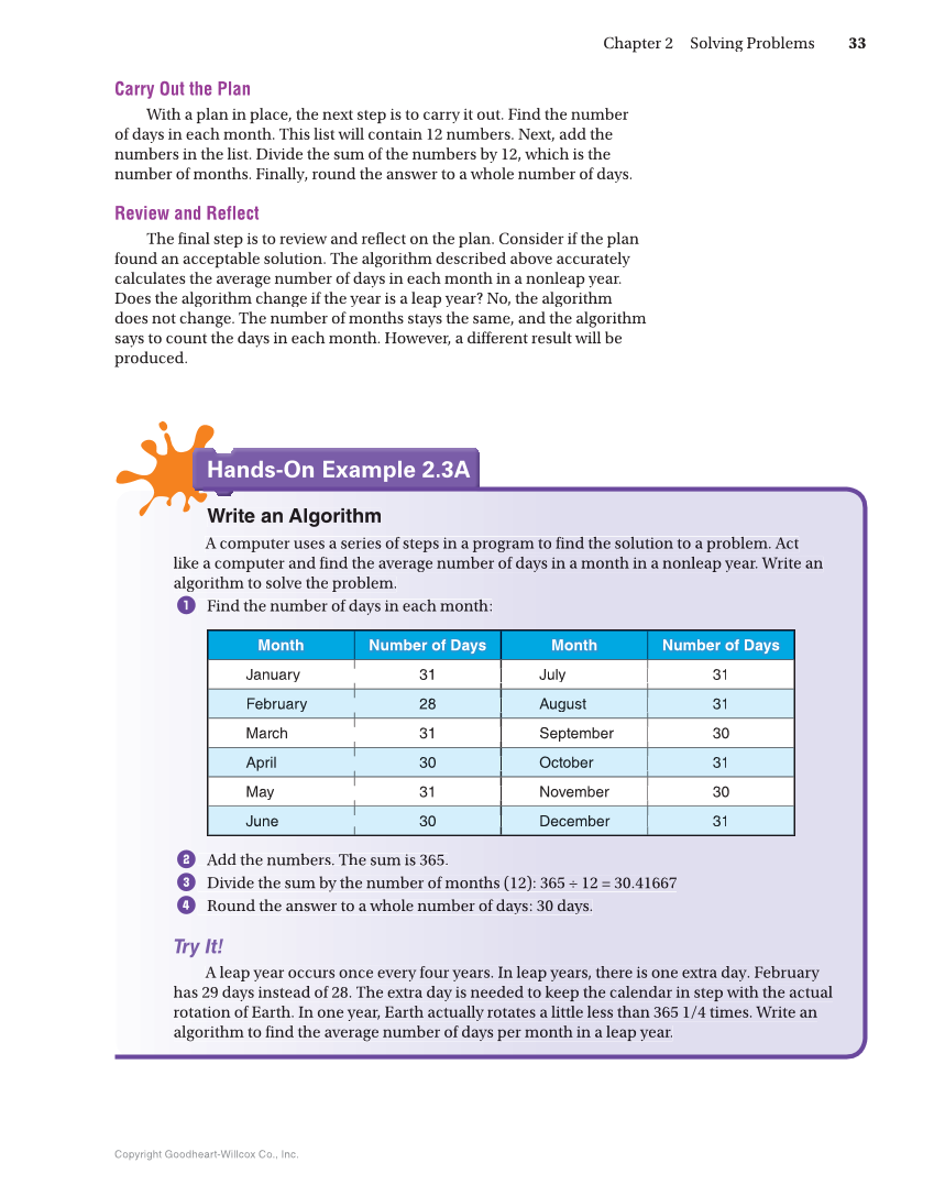 Hands-On Example 2.3A Hands-On Example 2.3A Write an Algorithm g A computer uses s a series of steps in a program to o find the solution to a problem. Act like a computer and find the average number of days in a month in a nonleap year. Write an algorithm to solve th he problem. 1 Find the numbe er of days in each month: Month Month Number of Days Number of Days Month Month Number of Days Number of Days January 31 July 31 February 28 August 31 31 September 30 March 30 October 31 April 31 November 30 May 30 December 31 June 2 Add the number rs . The sum is 365. 3 Divide the sum by the number of months (12): 365 6 ÷ 12 = 30.41667 4 Round the answ we r to a whole number of days: 30 0 days. Try It! A leap year occurs u once every four years. In leap y ye ars, there is one extra day. February has 29 days instead o of 28. The extra day is needed to k ke ep the calendar in step with the actual rotation of Earth. In o on e year, Earth actually rotates a little less than 365 1/4 times. Write an algorithm to find the e average number of days per month n in a leap year. Carry Out the Plan With a plan in place, the next step is to carry it out. Find the number of days in each month. This list will contain 12 numbers. Next, add the numbers in the list. Divide the sum of the numbers by 12, which is the number of months. Finally, round the answer to a whole number of days. Review and Reflect The final step is to review and reflect on the plan. Consider if the plan found an acceptable solution. The algorithm described above accurately calculates the average number of days in each month in a nonleap year. Does the algorithm change if the year is a leap year? No, the algorithm does not change. The number of months stays the same, and the algorithm says to count the days in each month. However, a different result will be produced. Copyright Goodheart-Willcox Co., Inc. Chapter 2 Solving Problems 33