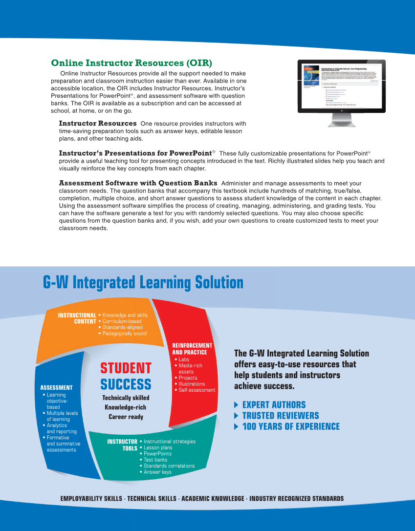 Online Instructor Resources (OIR) Online Instructor Resources provide all the support needed to make preparation and classroom instruction easier than ever. Available in one accessible location, the OIR includes Instructor Resources, Instructor’s Presentations for PowerPoint®, and assessment software with question banks. The OIR is available as a subscription and can be accessed at school, at home, or on the go. Instructor Resources One resource provides instructors with time-saving preparation tools such as answer keys, editable lesson plans, and other teaching aids. Instructor’s Presentations for PowerPoint® These fully customizable presentations for PowerPoint® provide a useful teaching tool for presenting concepts introduced in the text. Richly illustrated slides help you teach and visually reinforce the key concepts from each chapter. Assessment Software with Question Banks Administer and manage assessments to meet your classroom needs. The question banks that accompany this textbook include hundreds of matching, true/false, completion, multiple choice, and short answer questions to assess student knowledge of the content in each chapter. Using the assessment software simplifies the process of creating, managing, administering, and grading tests. You can have the software generate a test for you with randomly selected questions. You may also choose specific questions from the question banks and, if you wish, add your own questions to create customized tests to meet your classroom needs. EMPLOYABILITY SKILLS ∙ TECHNICAL SKILLS ∙ ACADEMIC KNOWLEDGE ∙ INDUSTRY RECOGNIZED STANDARDS The G-W Integrated Learning Solution offers easy-to-use resources that help students and instructors achieve success. EXPERT AUTHORS TRUSTED REVIEWERS 100 YEARS OF EXPERIENCE G-W Integrated Learning Solution ASSESSMENT • Learning objective- based • Multiple levels of learning • Analytics and reporting • Formative and summative assessments • Knowledge and skills • Curriculum-based • Standards-aligned • Pedagogically sound INSTRUCTIONAL CONTENT INSTRUCTOR TOOLS • Instructional strategies • Lesson plans • PowerPoints • Test banks • Standards correlations • Answer keys REINFORCEMENT AND PRACTICE • Labs • Media-rich assets • Projects • Illustrations • Self-assessment STUDENT SUCCESS Technically skilled Knowledge-rich Career ready