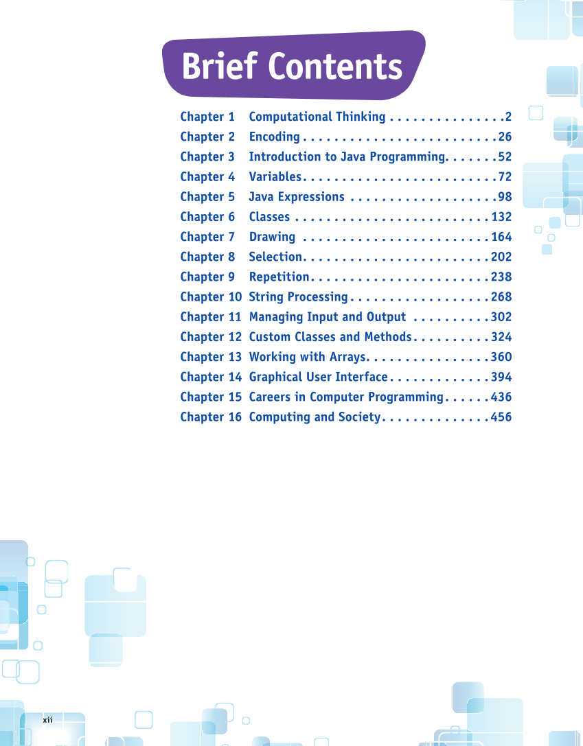 Brief Contents Chapter 1 Computational Thinking . . . . . . . . . . . . . . .2 Chapter 2 Encoding . . . . . . . . . . . . . . . . . . . . . . . . .26 Chapter 3 Introduction to Java Programming. . . . . . .52 Chapter 4 Variables. . . . . . . . . . . . . . . . . . . . . . . . .72 Chapter 5 Java Expressions . . . . . . . . . . . . . . . . . . .98 Chapter 6 Classes . . . . . . . . . . . . . . . . . . . . . . . . .132 Chapter 7 Drawing . . . . . . . . . . . . . . . . . . . . . . . .164 Chapter 8 Selection. . . . . . . . . . . . . . . . . . . . . . . .202 Chapter 9 Repetition. . . . . . . . . . . . . . . . . . . . . . .238 Chapter 10 String Processing . . . . . . . . . . . . . . . . . .268 Chapter 11 Managing Input and Output . . . . . . . . . .302 Chapter 12 Custom Classes and Methods. . . . . . . . . .324 Chapter 13 Working with Arrays. . . . . . . . . . . . . . . .360 Chapter 14 Graphical User Interface. . . . . . . . . . . . .394 Chapter 15 Careers in Computer Programming. . . . . .436 Chapter 16 Computing and Society. . . . . . . . . . . . . .456 xii