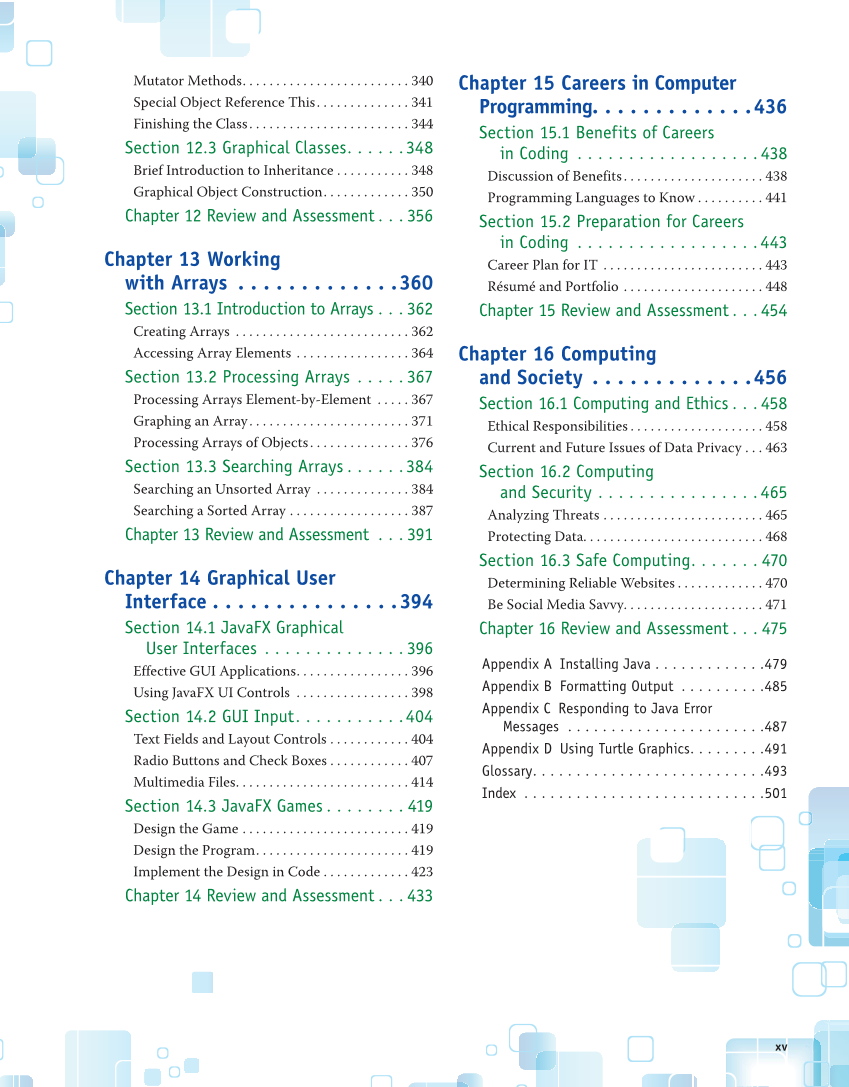 Mutator Methods. . . . . . . . . . . . . . . . . . . . . . . . . 340 Special Object Reference This. . . . . . . . . . . . . . 341 Finishing the Class. . . . . . . . . . . . . . . . . . . . . . . . 344 Section 12.3 Graphical Classes. . . . . .348 Brief Introduction to Inheritance . . . . . . . . . . . 348 Graphical Object Construction. . . . . . . . . . . . . 350 Chapter 12 Review and Assessment . . . 356 Chapter 13 Working with Arrays . . . . . . . . . . . . .360 Section 13.1 Introduction to Arrays . . .362 Creating Arrays . . . . . . . . . . . . . . . . . . . . . . . . . . 362 Accessing Array Elements . . . . . . . . . . . . . . . . . 364 Section 13.2 Processing Arrays . . . . .367 Processing Arrays Element-by-Element . . . . . 367 Graphing an Array. . . . . . . . . . . . . . . . . . . . . . . . 371 Processing Arrays of Objects. . . . . . . . . . . . . . . 376 Section 13.3 Searching Arrays . . . . . .384 Searching an Unsorted Array . . . . . . . . . . . . . . 384 Searching a Sorted Array . . . . . . . . . . . . . . . . . . 387 Chapter 13 Review and Assessment . . . 391 Chapter 14 Graphical User Interface . . . . . . . . . . . . . . .394 Section 14.1 JavaFX Graphical User Interfaces . . . . . . . . . . . . . .396 Effective GUI Applications. . . . . . . . . . . . . . . . . 396 Using JavaFX UI Controls . . . . . . . . . . . . . . . . . 398 Section 14.2 GUI Input. . . . . . . . . . .404 Text Fields and Layout Controls . . . . . . . . . . . . 404 Radio Buttons and Check Boxes . . . . . . . . . . . . 407 Multimedia Files. . . . . . . . . . . . . . . . . . . . . . . . . . 414 Section 14.3 JavaFX Games . . . . . . . . 419 Design the Game . . . . . . . . . . . . . . . . . . . . . . . . . 419 Design the Program. . . . . . . . . . . . . . . . . . . . . . . 419 Implement the Design in Code . . . . . . . . . . . . . 423 Chapter 14 Review and Assessment . . . 433 Chapter 15 Careers in Computer Programming. . . . . . . . . . . . .436 Section 15.1 Benefits of Careers in Coding . . . . . . . . . . . . . . . . . .438 Discussion of Benefits. . . . . . . . . . . . . . . . . . . . . 438 Programming Languages to Know . . . . . . . . . . 441 Section 15.2 Preparation for Careers in Coding . . . . . . . . . . . . . . . . . .443 Career Plan for IT . . . . . . . . . . . . . . . . . . . . . . . . 443 Résumé and Portfolio . . . . . . . . . . . . . . . . . . . . . 448 Chapter 15 Review and Assessment . . .454 Chapter 16 Computing and Society . . . . . . . . . . . . .456 Section 16.1 Computing and Ethics . . .458 Ethical Responsibilities . . . . . . . . . . . . . . . . . . . . 458 Current and Future Issues of Data Privacy . . . 463 Section 16.2 Computing and Security . . . . . . . . . . . . . . . .465 Analyzing Threats . . . . . . . . . . . . . . . . . . . . . . . . 465 Protecting Data. . . . . . . . . . . . . . . . . . . . . . . . . . . 468 Section 16.3 Safe Computing. . . . . . . 470 Determining Reliable Websites . . . . . . . . . . . . . 470 Be Social Media Savvy. . . . . . . . . . . . . . . . . . . . . 471 Chapter 16 Review and Assessment . . . 475 Appendix A Installing Java . . . . . . . . . . . . .479 Appendix B Formatting Output . . . . . . . . . .485 Appendix C Responding to Java Error Messages . . . . . . . . . . . . . . . . . . . . . . .487 Appendix D Using Turtle Graphics. . . . . . . . .491 Glossary. . . . . . . . . . . . . . . . . . . . . . . . . . .493 Index . . . . . . . . . . . . . . . . . . . . . . . . . . . .501 xv