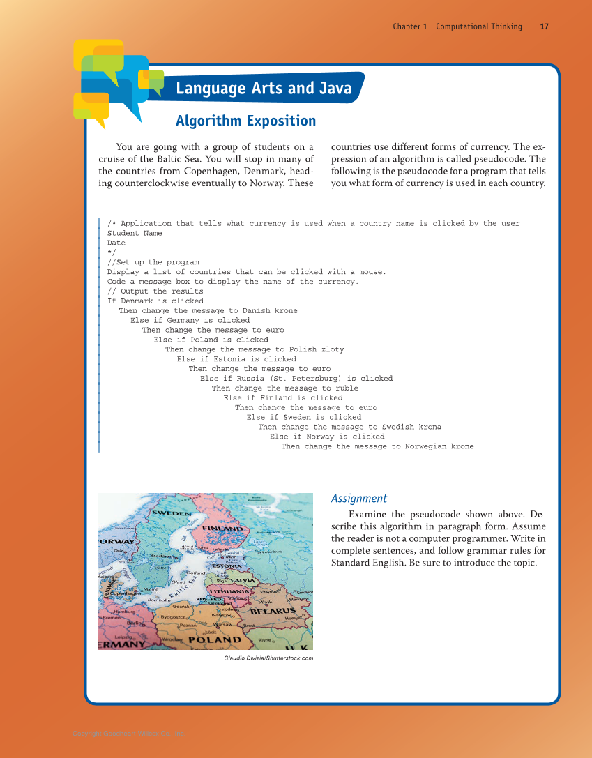 You are going with a group of students on a cruise of the Baltic Sea. You will stop in many of the countries from Copenhagen, Denmark, head- ing counterclockwise eventually to Norway. These Language Arts and Java Algorithm Exposition Claudio Divizia/Shutterstock.com /* Application that tells what currency is used when a country name is clicked by the user Student Name Date */ //Set up the program Display a list of countries that can be clicked with a mouse. Code a message box to display the name of the currency. // Output the results If Denmark is clicked Then change the message to Danish krone Else if Germany is clicked Then change the message to euro Else if Poland is clicked Then change the message to Polish zloty Else if Estonia is clicked Then change the message to euro Else if Russia (St. Petersburg) is clicked Then change the message to ruble Else if Finland is clicked Then change the message to euro Else if Sweden is clicked Then change the message to Swedish krona Else if Norway is clicked Then change the message to Norwegian krone Assignment Examine the pseudocode shown above. De- scribe this algorithm in paragraph form. Assume the reader is not a computer programmer. Write in complete sentences, and follow grammar rules for Standard English. Be sure to introduce the topic. countries use different forms of currency. The ex- pression of an algorithm is called pseudocode. The following is the pseudocode for a program that tells you what form of currency is used in each country. Chapter 1 Computational Thinking 17 Copyright Goodheart-Willcox Co., Inc.
