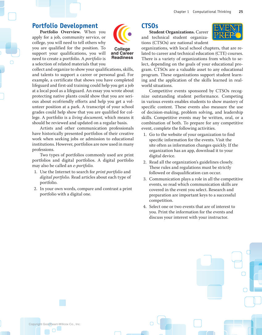 CTSOs Student Organizations. Career and technical student organiza- tions (CTSOs) are national student organizations, with local school chapters, that are re- lated to career and technical education (CTE) courses. There is a variety of organizations from which to se- lect, depending on the goals of your educational pro- gram. CTSOs are a valuable asset to any educational program. These organizations support student learn- ing and the application of the skills learned in real- world situations. Competitive events sponsored by CTSOs recog- nize outstanding student performance. Competing in various events enables students to show mastery of specific content. These events also measure the use of decision-making, problem solving, and leadership skills. Competitive events may be written, oral, or a combination of both. To prepare for any competitive event, complete the following activities. 1. Go to the website of your organization to find specific information for the events. Visit the site often as information changes quickly. If the organization has an app, download it to your digital device. 2. Read all the organization’s guidelines closely. These rules and regulations must be strictly followed or disqualification can occur. 3. Communication plays a role in all the competitive events, so read which communication skills are covered in the event you select. Research and preparation are important keys to a successful competition. 4. Select one or two events that are of interest to you. Print the information for the events and discuss your interest with your instructor. N EVENT E E E E E V V E N N N N N N N N T T T PREP P P P P P P P R P P P P P P EVENT PREP T N N N N N N N N N N N N N N N N N N N N E E V V V V E N N N N N N N T T T T V N N N N E E E E E E E E V V V V V V V V V V V V E E E E E E E E E N N N N N N N N N N N T T T T T T T T T T T T EVENT E E E E E E E E E E E E E E E E E E E E E E E E E E E E E E E E E E E E E E E E E E E V V V V V V V V V V V V V V V V V V V V V V V V V V V V V V V V V V V V V V V V V V E E E E E E E E E E E E E E E E E E E E E E E E N N N N N N N N N N N N N N N N N N N N N N N N N N N N N N N N N N N N N N N N N N N N N N N N N N N N T T T T T T T T T T T T T T T T T T T T T T T T T T T T T T T T T T T T T T T T T T T T T T T E E E V V V E E E N N N T T T V V V V V V V V V V V V T N E E E V V E E E N P P P P P P P R R R R E P P P P P P P P P P P R R R R R R R P P P P R PREP P P P P P P P P P P P P R R R R R R R R R R E E E E E E E P P P P P P P P P P P PREP P P P P P P P P P P P P P P P P P P P P P P P P P P P P P P P P P P P P P P P P P P P P P P R R R R R R R R R R R R R R R R R R R R R R R R R R R R R R R R R R R R R E E E E E E E E E E E E E E E E E E E E E P P P P P P P P P P P P P P P P P P P P P P P P P P P P P P P P P P P P P P P P P P P P P P P R R R E E E P P P PREP PREP P P P P P P P P P P P P P R R R R R R R R R R R R R E E E E E E E E E E P P P P P P P P P P P R R R E E E P P P P P P P P P P P P P P P P P P P P P P P P P P P P P P P P P P P P P P P P P P P R R R E E P P Portfolio Development Portfolio Overview. When you apply for a job, community service, or college, you will need to tell others why you are qualified for the position. To support your qualifications, you will need to create a portfolio. A portfolio is a selection of related materials that you collect and organize to show your qualifications, skills, and talents to support a career or personal goal. For example, a certificate that shows you have completed lifeguard and first-aid training could help you get a job at a local pool as a lifeguard. An essay you wrote about protecting native plants could show that you are seri- ous about ecofriendly efforts and help you get a vol- unteer position at a park. A transcript of your school grades could help show that you are qualified for col- lege. A portfolio is a living document, which means it should be reviewed and updated on a regular basis. Artists and other communication professionals have historically presented portfolios of their creative work when seeking jobs or admission to educational institutions. However, portfolios are now used in many professions. Two types of portfolios commonly used are print portfolios and digital portfolios. A digital portfolio may also be called an e-portfolio. 1. Use the Internet to search for print portfolio and digital portfolio. Read articles about each type of portfolio. 2. In your own words, compare and contrast a print portfolio with a digital one. College and Career Readiness Copyright Goodheart-Willcox Co., Inc. Chapter 1 Computational Thinking 25
