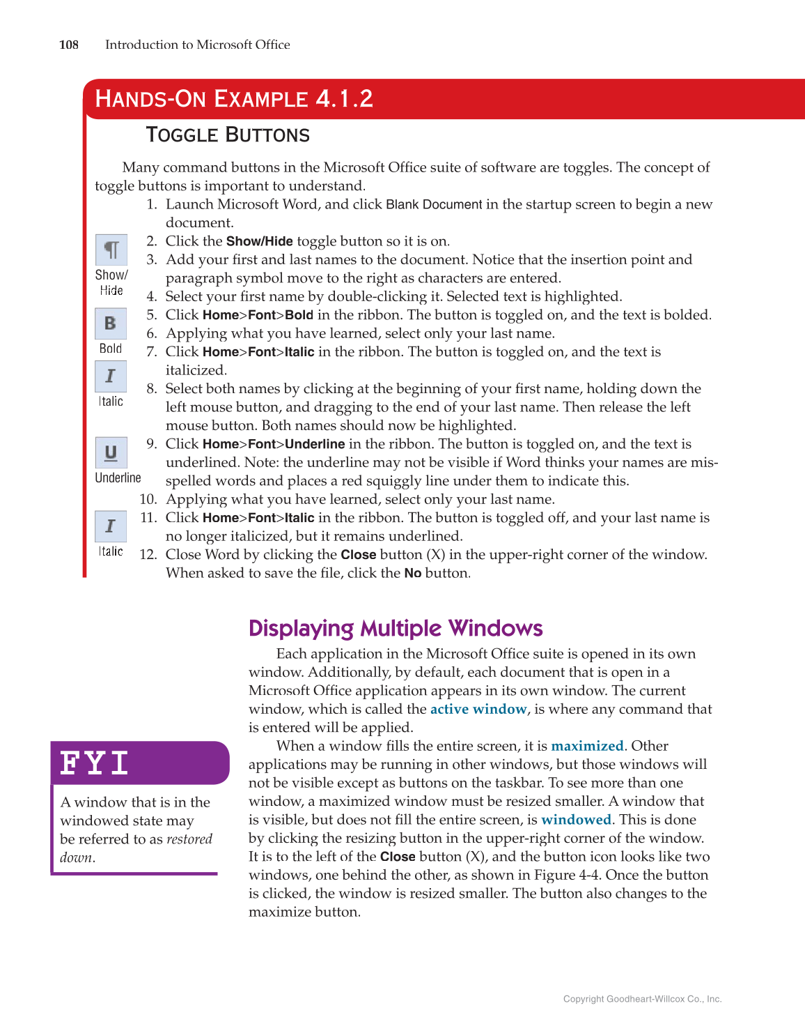 Many command buttons in the Microsoft Offi suite of software are toggles. The concept of fice