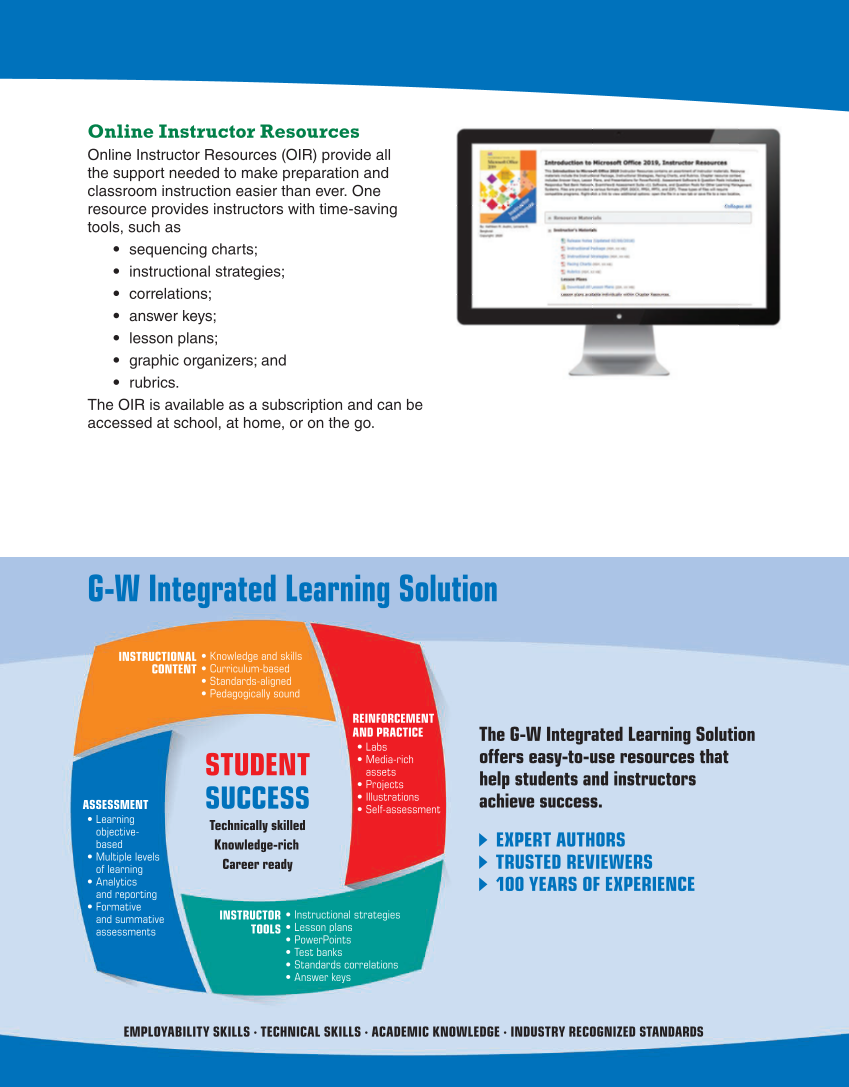 EMPLOYABILITY SKILLS ∙ TECHNICAL SKILLS ∙ ACADEMIC KNOWLEDGE ∙ INDUSTRY RECOGNIZED STANDARDS The G-W Integrated Learning Solution offers easy-to-use resources that help students and instructors achieve success. EXPERT AUTHORS TRUSTED REVIEWERS 100 YEARS OF EXPERIENCE G-W Integrated Learning Solution ASSESSMENT • Learning objective- based • Multiple levels of learning • Analytics and reporting • Formative and summative assessments • Knowledge and skills • Curriculum-based • Standards-aligned • Pedagogically sound INSTRUCTIONAL CONTENT INSTRUCTOR TOOLS • Instructional strategies • Lesson plans • PowerPoints • Test banks • Standards correlations • Answer keys REINFORCEMENT AND PRACTICE • Labs • Media-rich assets • Projects • Illustrations • Self-assessment STUDENT SUCCESS Technically skilled Knowledge-rich Career ready Online Instructor Resources Online Instructor Resources (OIR) provide all the support needed to make preparation and classroom instruction easier than ever. One resource provides instructors with time-saving tools, such as • sequencing charts • instructional strategies • correlations • answer keys • lesson plans • graphic organizers and • rubrics. The OIR is available as a subscription and can be accessed at school, at home, or on the go.