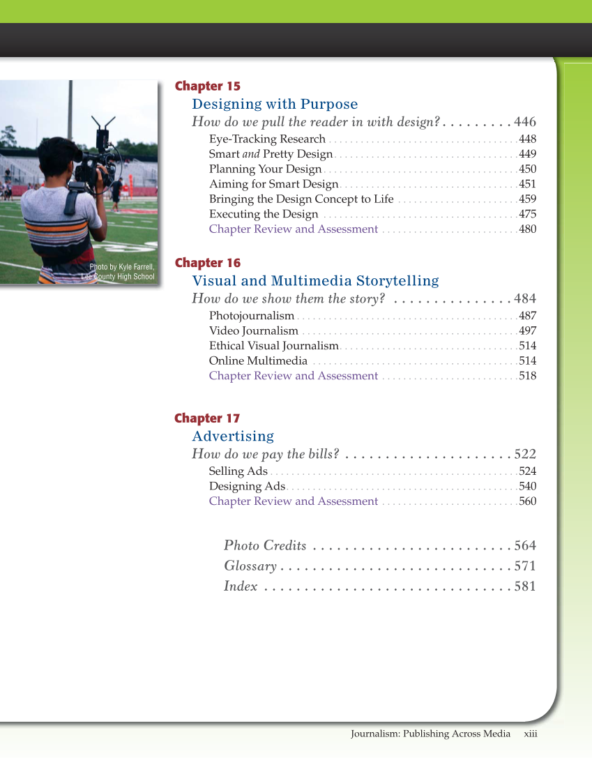 Journalism: Publishing Across Media xiii Chapter 15 Designing with Purpose How do we pull the reader in with design? . . . . . . . . . 446 Eye-Tracking Research . . . . . . . . . . . . . . . . . . . . . . . . . . . . . . . . . . . .448 Smart and Pretty Design . . . . . . . . . . . . . . . . . . . . . . . . . . . . . . . . . . .449 Planning Your Design . . . . . . . . . . . . . . . . . . . . . . . . . . . . . . . . . . . . .450 Aiming for Smart Design . . . . . . . . . . . . . . . . . . . . . . . . . . . . . . . . . .451 Bringing the Design Concept to Life . . . . . . . . . . . . . . . . . . . . . . .459 Executing the Design . . . . . . . . . . . . . . . . . . . . . . . . . . . . . . . . . . . . .475 Chapter Review and Assessment . . . . . . . . . . . . . . . . . . . . . . . . . .480 Chapter 16 Visual and Multimedia Storytelling How do we show them the story? . . . . . . . . . . . . . . . 484 Photojournalism . . . . . . . . . . . . . . . . . . . . . . . . . . . . . . . . . . . . . . . . . .487 Video Journalism . . . . . . . . . . . . . . . . . . . . . . . . . . . . . . . . . . . . . . . . .497 Ethical Visual Journalism . . . . . . . . . . . . . . . . . . . . . . . . . . . . . . . . . .514 Online Multimedia . . . . . . . . . . . . . . . . . . . . . . . . . . . . . . . . . . . . . . .514 Chapter Review and Assessment . . . . . . . . . . . . . . . . . . . . . . . . . .518 Chapter 17 Advertising How do we pay the bills? . . . . . . . . . . . . . . . . . . . . . 522 Selling Ads . . . . . . . . . . . . . . . . . . . . . . . . . . . . . . . . . . . . . . . . . . . . . . .524 Designing Ads . . . . . . . . . . . . . . . . . . . . . . . . . . . . . . . . . . . . . . . . . . . .540 Chapter Review and Assessment . . . . . . . . . . . . . . . . . . . . . . . . . .560 Photo Credits . . . . . . . . . . . . . . . . . . . . . . . . . 564 Glossary . . . . . . . . . . . . . . . . . . . . . . . . . . . . . 571 Index . . . . . . . . . . . . . . . . . . . . . . . . . . . . . . . 581 Photo by Kyle Farrell, Lee County High School