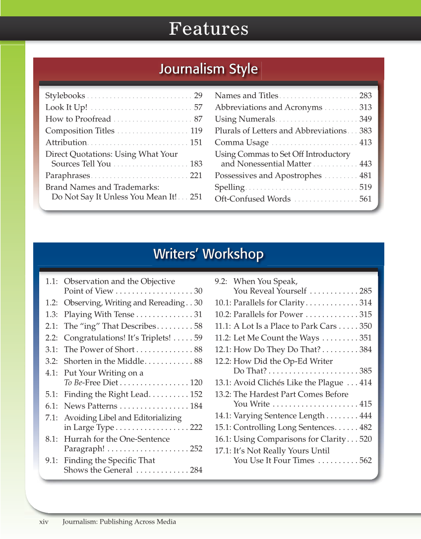 xiv Journalism: Publishing Across Media Features Writers’ Workshop Writers’ Workshop Journalism Style Journalism Style Stylebooks . . . . . . . . . . . . . . . . . . . . . . . . . . . . 29 Look It Up! . . . . . . . . . . . . . . . . . . . . . . . . . . . 57 How to Proofread . . . . . . . . . . . . . . . . . . . . . 87 Composition Titles . . . . . . . . . . . . . . . . . . . 119 Attribution . . . . . . . . . . . . . . . . . . . . . . . . . . . 151 Direct Quotations: Using What Your Sources Tell You . . . . . . . . . . . . . . . . . . . . 183 Paraphrases . . . . . . . . . . . . . . . . . . . . . . . . . . 221 Brand Names and Trademarks: Do Not Say It Unless You Mean It! . . . 251 Names and Titles . . . . . . . . . . . . . . . . . . . . . 283 Abbreviations and Acronyms . . . . . . . . . 313 Using Numerals . . . . . . . . . . . . . . . . . . . . . . 349 Plurals of Letters and Abbreviations . . . 383 Comma Usage . . . . . . . . . . . . . . . . . . . . . . . 413 Using Commas to Set Off Introductory and Nonessential Matter . . . . . . . . . . . . 443 Possessives and Apostrophes . . . . . . . . . 481 Spelling . . . . . . . . . . . . . . . . . . . . . . . . . . . . . . 519 Oft-Confused Words . . . . . . . . . . . . . . . . . 561 1.1: Observation and the Objective Point of View . . . . . . . . . . . . . . . . . . . 30 1.2: Observing, Writing and Rereading . . 30 1.3: Playing With Tense . . . . . . . . . . . . . . 31 2.1: The “ing” That Describes . . . . . . . . . 58 2.2: Congratulations! It’s Triplets! . . . . . 59 3.1: The Power of Short . . . . . . . . . . . . . . 88 3.2: Shorten in the Middle . . . . . . . . . . . . 88 4.1: Put Your Writing on a To Be-Free Diet . . . . . . . . . . . . . . . . . 120 5.1: Finding the Right Lead . . . . . . . . . . 152 6.1: News Patterns . . . . . . . . . . . . . . . . . 184 7.1: Avoiding Libel and Editorializing in Large Type . . . . . . . . . . . . . . . . . . 222 8.1: Hurrah for the One-Sentence Paragraph! . . . . . . . . . . . . . . . . . . . . 252 9.1: Finding the Specifi c That Shows the General . . . . . . . . . . . . . 284 9.2: When You Speak, You Reveal Yourself . . . . . . . . . . . . 285 10.1: Parallels for Clarity . . . . . . . . . . . . . 314 10.2: Parallels for Power . . . . . . . . . . . . . 315 11.1: A Lot Is a Place to Park Cars . . . . . 350 11.2: Let Me Count the Ways . . . . . . . . . 351 12.1: How Do They Do That? . . . . . . . . . 384 12.2: How Did the Op-Ed Writer Do That? . . . . . . . . . . . . . . . . . . . . . . 385 13.1: Avoid Clichés Like the Plague . . . 414 13.2: The Hardest Part Comes Before You Write . . . . . . . . . . . . . . . . . . . . . 415 14.1: Varying Sentence Length . . . . . . . . 444 15.1: Controlling Long Sentences . . . . . . 482 16.1: Using Comparisons for Clarity . . . 520 17.1: It’s Not Really Yours Until You Use It Four Times . . . . . . . . . . 562