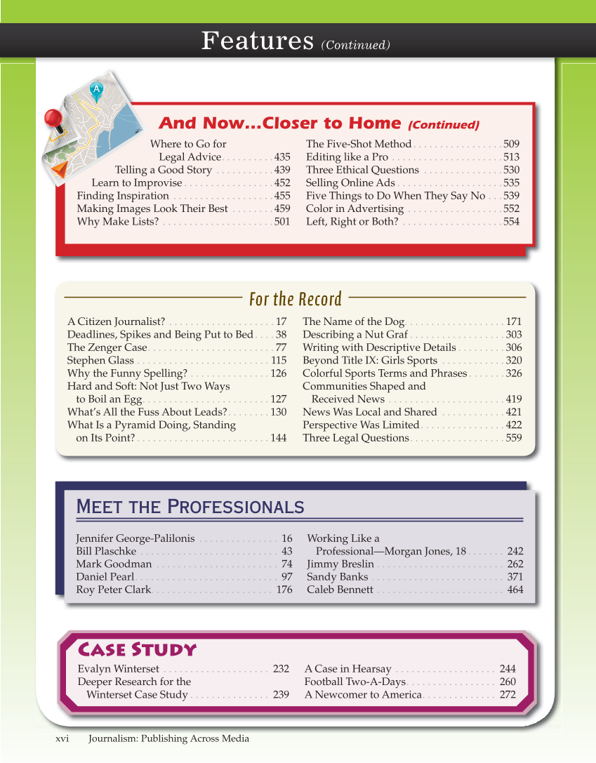 xvi Journalism: Publishing Across Media Features (Continued) Meet the Professionals Jennifer George-Palilonis . . . . . . . . . . . . . . . 16 Bill Plaschke . . . . . . . . . . . . . . . . . . . . . . . . . . 43 Mark Goodman . . . . . . . . . . . . . . . . . . . . . . . 74 Daniel Pearl . . . . . . . . . . . . . . . . . . . . . . . . . . . 97 Roy Peter Clark. . . . . . . . . . . . . . . . . . . . . . . 176 Working Like a Professional—Morgan Jones, 18 . . . . . . . 242 Jimmy Breslin . . . . . . . . . . . . . . . . . . . . . . . . 262 Sandy Banks . . . . . . . . . . . . . . . . . . . . . . . . . 371 Caleb Bennett . . . . . . . . . . . . . . . . . . . . . . . . 464 Case Study Evalyn Winterset . . . . . . . . . . . . . . . . . . . . 232 Deeper Research for the Winterset Case Study . . . . . . . . . . . . . . . 239 A Case in Hearsay . . . . . . . . . . . . . . . . . . . 244 Football Two-A-Days . . . . . . . . . . . . . . . . . 260 A Newcomer to America . . . . . . . . . . . . . . 272 For the Record A Citizen Journalist? . . . . . . . . . . . . . . . . . . . . 17 Deadlines, Spikes and Being Put to Bed . . . . 38 The Zenger Case . . . . . . . . . . . . . . . . . . . . . . . . 77 Stephen Glass . . . . . . . . . . . . . . . . . . . . . . . . . 115 Why the Funny Spelling? . . . . . . . . . . . . . . . 126 Hard and Soft: Not Just Two Ways to Boil an Egg . . . . . . . . . . . . . . . . . . . . . . . . 127 What’s All the Fuss About Leads? . . . . . . . . 130 What Is a Pyramid Doing, Standing on Its Point? . . . . . . . . . . . . . . . . . . . . . . . . . 144 The Name of the Dog. . . . . . . . . . . . . . . . . . . 171 Describing a Nut Graf . . . . . . . . . . . . . . . . . . 303 Writing with Descriptive Details . . . . . . . . . 306 Beyond Title IX: Girls Sports . . . . . . . . . . . . 320 Colorful Sports Terms and Phrases . . . . . . . 326 Communities Shaped and Received News . . . . . . . . . . . . . . . . . . . . . . 419 News Was Local and Shared . . . . . . . . . . . . 421 Perspective Was Limited . . . . . . . . . . . . . . . . 422 Three Legal Questions . . . . . . . . . . . . . . . . . . 559 And Now…Closer to Home (Continued) Where to Go for Legal Advice . . . . . . . . . . 435 Telling a Good Story . . . . . . . . . . . 439 Learn to Improvise . . . . . . . . . . . . . . . . . 452 Finding Inspiration . . . . . . . . . . . . . . . . . . . 455 Making Images Look Their Best . . . . . . . . 459 Why Make Lists? . . . . . . . . . . . . . . . . . . . . . 501 The Five-Shot Method . . . . . . . . . . . . . . . . . 509 Editing like a Pro . . . . . . . . . . . . . . . . . . . . . 513 Three Ethical Questions . . . . . . . . . . . . . . . 530 Selling Online Ads . . . . . . . . . . . . . . . . . . . . 535 Five Things to Do When They Say No . . . 539 Color in Advertising . . . . . . . . . . . . . . . . . . 552 Left, Right or Both? . . . . . . . . . . . . . . . . . . . 554