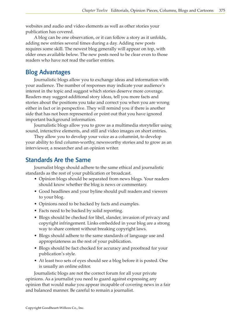 Copyright Goodheart-Willcox Co., Inc. Chapter Twelve Editorials, Opinion Pieces, Columns, Blogs and Cartoons 375 websites and audio and video elements as well as other stories your publication has covered. A blog can be one observation, or it can follow a story as it unfolds, adding new entries several times during a day. Adding new posts requires some skill. The newest blog generally will appear on top, with older ones available below. The new posts need to be clear even to those readers who have not read the earlier entries. Blog Advantages Journalistic blogs allow you to exchange ideas and information with your audience. The number of responses may indicate your audience’s interest in the topic and suggest which stories deserve more coverage. Readers may suggest additional story ideas, tell you more facts and stories about the positions you take and correct you when you are wrong either in fact or in perspective. They will remind you if there is another side that has not been represented or point out that you have ignored important background information. Journalistic blogs allow you to grow as a multimedia storyteller using sound, interactive elements, and still and video images on short entries. They allow you to develop your voice as a columnist, to develop your ability to fi nd column-worthy, newsworthy stories and to grow as an interviewer, a researcher and an opinion writer. Standards Are the Same Journalist blogs should adhere to the same ethical and journalistic standards as the rest of your publication or broadcast. • Opinion blogs should be separated from news blogs. Your readers should know whether the blog is news or commentary. • Good headlines and your byline should pull readers and viewers to your blog. • Opinions need to be backed by facts and examples. • Facts need to be backed by solid reporting. • Blogs should be checked for libel, slander, invasion of privacy and copyright infringement. Links embedded in your blog are a strong way to share content without breaking copyright laws. • Blogs should adhere to the same standards of language use and appropriateness as the rest of your publication. • Blogs should be fact checked for accuracy and proofread for your publication’s style. • At least two sets of eyes should see a blog before it is posted. One is usually an online editor. Journalistic blogs are not the correct forum for all your private opinions. As a journalist you need to guard against expressing any opinion that would make you appear incapable of covering news in a fair and balanced manner. Be careful to remain a journalist.