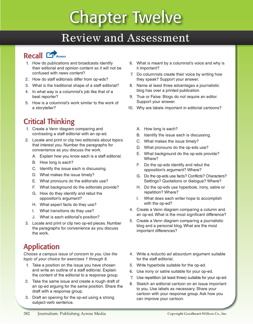 Copyright Goodheart-Willcox Co., Inc. 382 Journalism: Publishing Across Media Review and Assessment Chapter Twelve Chapter Twelve Application Choose a campus issue of concern to you. Use the topic of your choice for exercises 1 through 8. 1. Take a position on the issue you have chosen and write an outline of a staff editorial. Explain the content of the editorial to a response group. 2. Take the same issue and create a rough draft of an op-ed arguing for the same position. Share the draft with a response group. 3. Draft an opening for the op-ed using a strong subject-verb sentence. 4. Write a reductio ad absurdum argument suitable for the staff editorial. 5. Write hyperbole suitable for the op-ed. 6. Use irony or satire suitable for your op-ed. 7. Use repetition (at least three) suitable for your op-ed. 8. Sketch an editorial cartoon on an issue important to you. Use labels as necessary. Share your cartoon with your response group. Ask how you can improve your cartoon. Critical Thinking Critical Thinking 1. Create a Venn diagram comparing and contrasting a staff editorial with an op-ed. 2. Locate and print or clip two editorials about topics that interest you. Number the paragraphs for convenience as you discuss the work. A. Explain how you know each is a staff editorial. B. How long is each? C. Identify the issue each is discussing. D. What makes the issue timely? E. What pronouns do the editorials use? F. What background do the editorials provide? G. How do they identify and rebut the opposition’s argument? H. What expert facts do they use? I. What transitions do they use? J. What is each editorial’s position? 3. Locate and print or clip two op-ed pieces. Number the paragraphs for convenience as you discuss the work. A. How long is each? B. Identify the issue each is discussing. C. What makes the issue timely? D. What pronouns do the op-eds use? E. What background do the op-eds provide? Where? F. Do the op-eds identify and rebut the opposition’s argument? Where? G. Do the op-eds use facts? Conflicts? Characters? Settings? Quotations or dialogue? Where? H. Do the op-eds use hyperbole, irony, satire or repetition? Where? I. What does each writer hope to accomplish with the op-ed? 4. Create a Venn diagram comparing a column and an op-ed. What is the most significant difference? 5. Create a Venn diagram comparing a journalistic blog and a personal blog. What are the most important differences? Recall 1. How do publications and broadcasts identify their editorial and opinion content so it will not be confused with news content? 2. How do staff editorials differ from op-eds? 3. What is the traditional shape of a staff editorial? 4. In what way is a columnist’s job like that of a beat reporter? 5. How is a columnist’s work similar to the work of a storyteller? 6. What is meant by a columnist’s voice and why is it important? 7. Do columnists create their voice by writing how they speak? Support your answer. 8. Name at least three advantages a journalistic blog has over a printed publication. 9. True or False: Blogs do not require an editor. Support your answer. 10. Why are labels important in editorial cartoons? Assess