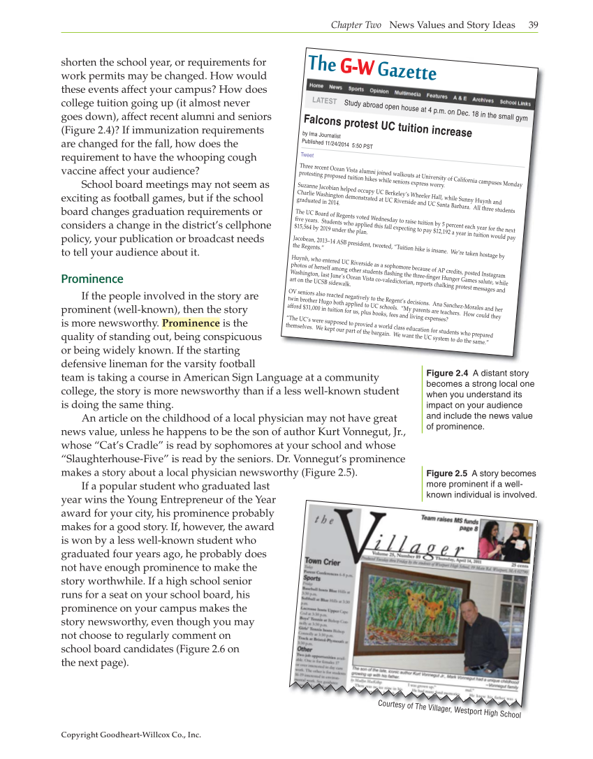 Copyright Goodheart-Willcox Co., Inc. Chapter Two News Values and Story Ideas 39 shorten the school year, or requirements for work permits may be changed. How would these events affect your campus? How does college tuition going up (it almost never goes down), affect recent alumni and seniors (Figure 2.4)? If immunization requirements are changed for the fall, how does the requirement to have the whooping cough vaccine affect your audience? School board meetings may not seem as exciting as football games, but if the school board changes graduation requirements or considers a change in the district’s cellphone policy, your publication or broadcast needs to tell your audience about it. Prominence If the people involved in the story are prominent (well-known), then the story is more newsworthy. Prominence is the quality of standing out, being conspicuous or being widely known. If the starting defensive lineman for the varsity football team is taking a course in American Sign Language at a community college, the story is more newsworthy than if a less well-known student is doing the same thing. An article on the childhood of a local physician may not have great news value, unless he happens to be the son of author Kurt Vonnegut, Jr., whose “Cat’s Cradle” is read by sophomores at your school and whose “Slaughterhouse-Five” is read by the seniors. Dr. Vonnegut’s prominence makes a story about a local physician newsworthy (Figure 2.5). If a popular student who graduated last year wins the Young Entrepreneur of the Year award for your city, his prominence probably makes for a good story. If, however, the award is won by a less well-known student who graduated four years ago, he probably does not have enough prominence to make the story worthwhile. If a high school senior runs for a seat on your school board, his prominence on your campus makes the story newsworthy, even though you may not choose to regularly comment on school board candidates (Figure 2.6 on the next page). Figure 2.4 A distant story becomes a strong local one when you understand its impact on your audience and include the news value of prominence. The G-W G-W Gazette Falcons protest UC tuition increase by Ima Journalist Published 11/24/2014 5:50 PST Tweet Three recent Ocean Vista alumni joined walkouts at University of California campuses Monday protesting proposed tuition hikes while seniors express worry. Suzanne Jacobian helped occupy UC Berkeley’s Wheeler Hall, while Sunny Huynh and Charlie Washington demonstrated at UC Riverside and UC Santa Barbara. All three students graduated in 2014. The UC Board of Regents voted Wednesday to raise tuition by 5 percent each year for the next five years. Students who applied this fall expecting to pay $12,192 a year in tuition would pay $15,564 by 2019 under the plan. Jacobean, 2013–14 ASB president, tweeted, “Tuition hike is insane. We’re taken hostage by the Regents.” Huynh, who entered UC Riverside as a sophomore because of AP credits, posted Instagram photos of herself among other students flashing the three-finger Hunger Games salute, while Washington, last June’s Ocean Vista co-valedictorian, reports chalking protest messages and art on the UCSB sidewalk. OV seniors also reacted negatively to the Regent’s decisions. Ana Sanchez-Morales and her twin brother Hugo both applied to UC schools. “My parents are teachers. How could they afford $31,000 in tuition for us, plus books, fees and living expenses? “The UC’s were supposed to provied a world class education for students who prepared themselves. We kept our part of the bargain. We want the UC system to do the same.” LATEST Study abroad open house at 4 p.m. on Dec. 18 in the small gym Figure 2.5 A story becomes more prominent if a well- known individual is involved. Courtesy of The Villager, Westport High School