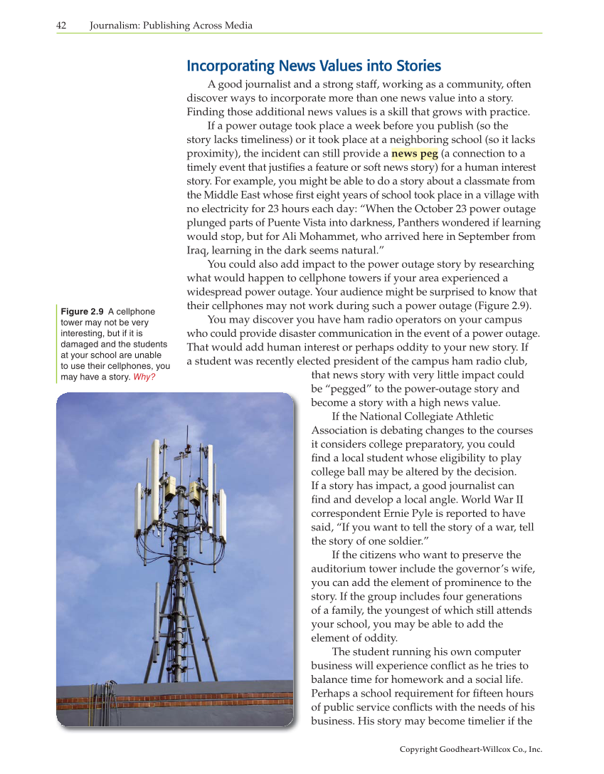 Copyright Goodheart-Willcox Co., Inc. 42 Journalism: Publishing Across Media Incorporating News Values into Stories Incorporating News Values into Stories A good journalist and a strong staff, working as a community, often discover ways to incorporate more than one news value into a story. Finding those additional news values is a skill that grows with practice. If a power outage took place a week before you publish (so the story lacks timeliness) or it took place at a neighboring school (so it lacks proximity), the incident can still provide a news peg (a connection to a timely event that justifi es a feature or soft news story) for a human interest story. For example, you might be able to do a story about a classmate from the Middle East whose fi rst eight years of school took place in a village with no electricity for 23 hours each day: “When the October 23 power outage plunged parts of Puente Vista into darkness, Panthers wondered if learning would stop, but for Ali Mohammet, who arrived here in September from Iraq, learning in the dark seems natural.” You could also add impact to the power outage story by researching what would happen to cellphone towers if your area experienced a widespread power outage. Your audience might be surprised to know that their cellphones may not work during such a power outage (Figure 2.9). You may discover you have ham radio operators on your campus who could provide disaster communication in the event of a power outage. That would add human interest or perhaps oddity to your new story. If a student was recently elected president of the campus ham radio club, that news story with very little impact could be “pegged” to the power-outage story and become a story with a high news value. If the National Collegiate Athletic Association is debating changes to the courses it considers college preparatory, you could fi nd a local student whose eligibility to play college ball may be altered by the decision. If a story has impact, a good journalist can fi nd and develop a local angle. World War II correspondent Ernie Pyle is reported to have said, “If you want to tell the story of a war, tell the story of one soldier.” If the citizens who want to preserve the auditorium tower include the governor’s wife, you can add the element of prominence to the story. If the group includes four generations of a family, the youngest of which still attends your school, you may be able to add the element of oddity. The student running his own computer business will experience confl ict as he tries to balance time for homework and a social life. Perhaps a school requirement for fi fteen hours of public service confl icts with the needs of his business. His story may become timelier if the Figure 2.9 A cellphone tower may not be very interesting, but if it is damaged and the students at your school are unable to use their cellphones, you may have a story. Why?