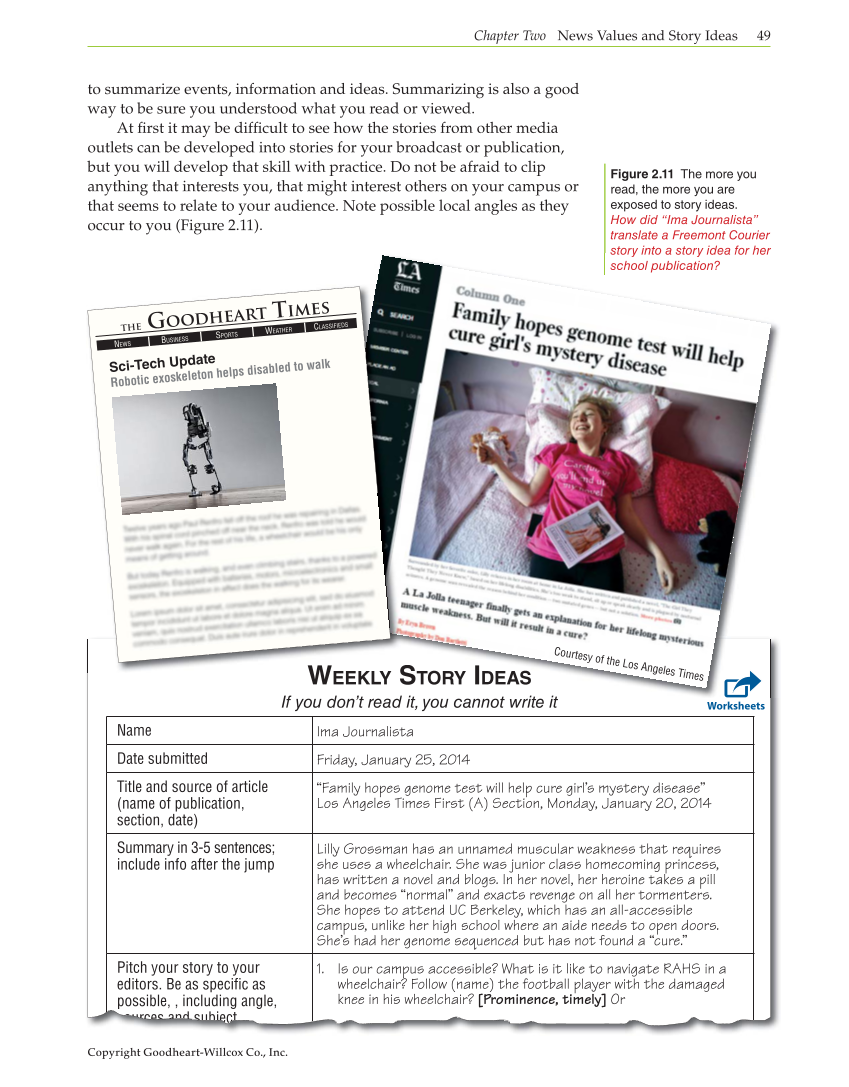 Copyright Goodheart-Willcox Co., Inc. Chapter Two News Values and Story Ideas 49 to summarize events, information and ideas. Summarizing is also a good way to be sure you understood what you read or viewed. At fi rst it may be diffi cult to see how the stories from other media outlets can be developed into stories for your broadcast or publication, but you will develop that skill with practice. Do not be afraid to clip anything that interests you, that might interest others on your campus or that seems to relate to your audience. Note possible local angles as they occur to you (Figure 2.11). Figure 2.11 The more you read, the more you are exposed to story ideas. How did “Ima Journalista” translate a Freemont Courier story into a story idea for her school publication? WEEKLY STORY IDEAS If you don’t read it, you cannot write it Name Ima Journalista Date submitted Friday, January 25, 2014 Title and source of article (name of publication, section, date) “Family hopes genome test will help cure girl’s mystery disease” Los Angeles Times First (A) Section, Monday, January 20, 2014 Summary in 3-5 sentences include info after the jump Lilly Grossman has an unnamed muscular weakness that requires she uses a wheelchair. She was junior class homecoming princess, has written a novel and blogs. In her novel, her heroine takes a pill and becomes “normal” and exacts revenge on all her tormenters. She hopes to attend UC Berkeley, which has an all-accessible campus, unlike her high school where an aide needs to open doors. She’s had her genome sequenced but has not found a “cure.” Pitch your story to your editors. Be as specific as possible, , including angle, sources and subject. 1. Is our campus accessible? What is it like to navigate RAHS in a wheelchair? Follow (name) the football player with the damaged knee in his wheelchair? [Prominence, timely] Or story into a story idea for her s chool publication? W EEKLY S TORY I DEAS do ’t ead it o ca ot ite it W W EEKLY S Sci-Tech Updatehelps Robotic exoskeleton disabled to walk the Goodheart Times NEWS BUSINESS SPORTS WEATHER CLASSIFIEDS Worksheets Courtesy of the Los Angeles Times