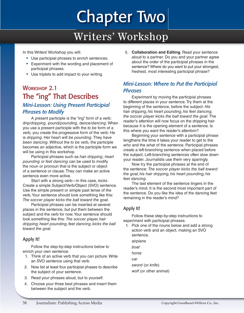 Copyright Goodheart-Willcox Co., Inc. 58 Journalism: Publishing Across Media Writers’ Workshop Chapter Two Chapter Two In this Writers’ Workshop you will: • Use participial phrases to enrich sentences. • Experiment with the wording and placement of participial phrases. • Use triplets to add impact to your writing. WORKSHOP 2.1 W ORKSHOP 2.1 The “ing” That Describes The “ing” That Describes Mini-Lesson: Using Present Participial Phrases to Modify A present participle is the “ing” form of a verb: drip/dripping, pound/pounding, dance/dancing. When you use a present participle with the to be form of a verb, you create the progressive form of the verb: He is dripping. Her heart will be pounding. They have been dancing. Without the to be verb, the participle becomes an adjective, which is the participle form we will be using in this workshop. Participial phrases such as hair dripping, heart pounding or feet dancing can be used to modify the noun or pronoun that is the subject or object of a sentence or clause. They can make an active sentence even more active. Start with a strong verb—in this case, kicks. Create a simple Subject/Verb/Object (SVO) sentence. Use the simple present or simple past tense of the verb. Your sentence should look something like this: The soccer player kicks the ball toward the goal. Participial phrases can be inserted at several places in the sentence, but put them between the subject and the verb for now. Your sentence should look something like this: The soccer player, hair dripping, heart pounding, feet dancing, kicks the ball toward the goal. Apply It! Follow the step-by-step instructions below to enrich your own sentence. 1. Think of an active verb that you can picture. Write an SVO sentence using that verb. 2. Now list at least four participial phases to describe the subject of your sentence. 3. Read your phrases aloud, but to yourself. 4. Choose your three best phrases and insert them between the subject and the verb. 5. Collaboration and Editing. Read your sentence aloud to a partner. Do you and your partner agree about the order of the participial phrases in the sentence? Where do you want to put your strongest, freshest, most interesting participial phrase? Mini-Lesson: Where to Put the Participial Phrases Experiment by moving the participial phrases to different places in your sentence. Try them at the beginning of the sentence, before the subject: His hair dripping, his heart pounding, his feet dancing, the soccer player kicks the ball toward the goal. The reader’s attention will now focus on the dripping hair because it is the opening element of a sentence. Is this where you want the reader’s attention? Beginning your sentence with a participial phrase lengthens the time it takes your reader to get to the who and the what of the sentence. Participial phrases create a left-branching sentence when placed before the subject. Left-branching sentences often slow down your reader. Journalists use them very sparingly. Now try the participial phrases at the end of the sentence: The soccer player kicks the ball toward the goal, his hair dripping, his heart pounding, his feet dancing. The last element of the sentence lingers in the reader’s mind. It is the second most important part of the sentence. Do you like the idea of the dancing feet remaining in the reader’s mind? Apply It! Follow these step-by-step instructions to experiment with participial phrases. 1. Pick one of the nouns below and add a strong action verb and an object, making an SVO sentence. airplane boat horse car sword (or knife) wolf (or other animal)