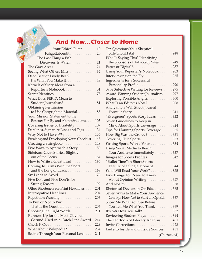 xv And Now…Closer to Home Your Ethical Filter . . . . . . . . 10 Fahgettaboudit . . . . . . . . . . . . . . . 20 The Last Thing a Fish Discovers Is Water. . . . . . . . . . . . . . . 21 The Gray Areas . . . . . . . . . . . . . . . . . . . . . . . . 24 Seeing What Others Miss . . . . . . . . . . . . . . . 34 Dead Beat or Lively Beat? It’s What You Make It . . . . . . . . . . . . . . . . . 48 Kernels of Story Ideas from a Reporter’s Notebook . . . . . . . . . . . . . . . . . 51 Secret Identities . . . . . . . . . . . . . . . . . . . . . . . 78 What Does FERPA Mean to Student Journalists? . . . . . . . . . . . . . . . . . . 81 Obtaining Permission to Use Copyrighted Material. . . . . . . . . . . 85 Your Mission Statement to the Rescue: For, By and About Students . . . . . 105 Covering Issues of Disability . . . . . . . . . . . 107 Datelines, Signature Lines and Tags . . . . . . 134 Why Not to Have Why . . . . . . . . . . . . . . . . 136 Breaking and Developing News Checklist . . 148 Creating a Stringbook . . . . . . . . . . . . . . . . . 149 Five Ways to Approach a Story . . . . . . . . . 159 Sidebars: Great Stories, Slightly out of the Focus . . . . . . . . . . . . . . . . . . . . . 164 How to Write a Great Lead . . . . . . . . . . . . . 165 Coming to Terms With the Short and the Long of Leads . . . . . . . . . . . . . . . 168 Six Leads to Avoid . . . . . . . . . . . . . . . . . . . . 173 Five Do’s and Five Don’ts for Strong Teasers . . . . . . . . . . . . . . . . . . . . . . 192 Other Shorteners for Print Headlines . . . . . 201 Interrogative Headlines . . . . . . . . . . . . . . . . 204 Repetition Warning!. . . . . . . . . . . . . . . . . . . 206 To Pun or Not to Pun: That Is the Question . . . . . . . . . . . . . . . . . 206 Choosing the Right Words . . . . . . . . . . . . . 211 Runners-Up for the Most-Obvious- Gerund-Used-in-a-Catch-Line Award . . 214 Check It Out . . . . . . . . . . . . . . . . . . . . . . . . . 229 What About Wikipedia? . . . . . . . . . . . . . . . 234 Seeing Through Your Personal Lens . . . . . . 241 Ten Questions Your Skeptical Side Should Ask . . . . . . . . . . . . . . . . . . . . 248 Who Is Saying This? Identifying the Sponsors of Advocacy Sites . . . . . . . 249 Paper or Digital? . . . . . . . . . . . . . . . . . . . . . . 257 Using Your Reporter’s Notebook . . . . . . . 263 Interviewing on the Fly . . . . . . . . . . . . . . . . 265 Ingredients for a Successful Personality Profi le . . . . . . . . . . . . . . . . . . . 290 Save Subjective Writing for Reviews . . . . . 295 Award-Winning Student Journalism . . . . . 297 Exploring Possible Angles . . . . . . . . . . . . . 300 What Is an Editor’s Note? . . . . . . . . . . . . . . 308 Analyzing a Wall Street Journal Formula Story . . . . . . . . . . . . . . . . . . . . . . 311 “Evergreen” Sports Story Ideas . . . . . . . . . 322 Seven Guidelines to Keep in Mind About Sports Coverage . . . . . . . . . 324 Tips for Planning Sports Coverage . . . . . . 325 How Big Was the Crowd? . . . . . . . . . . . . . . 331 Covering Club Sports . . . . . . . . . . . . . . . . . 333 Writing Sports With a Voice . . . . . . . . . . . . 334 Using Social Media to Reach Your Audience Immediately . . . . . . . . . . 337 Images for Sports Profiles . . . . . . . . . . . . . . 342 “Bullet Time”: A Short Sports Feature of a Single Moment. . . . . . . . . . . 344 Who Will Read Your Work? . . . . . . . . . . . . 355 Five Things You Need to Know About Opinion Writing . . . . . . . . . . . . . . 357 And Not You . . . . . . . . . . . . . . . . . . . . . . . . . 358 Rhetorical Devices in Op-Eds . . . . . . . . . . . 365 Seven Ways to Make Your Audience Cranky: How Not to Start an Op-Ed . . . . . 367 Show Me What You See Before You Tell Me What You Think . . . . . . . . . 369 It’s Not How You Talk! . . . . . . . . . . . . . . . . . 372 Reviewing Student Plays . . . . . . . . . . . . . . 394 The Ten Tools of Literary Analysis . . . . . . 401 Invite Corrections. . . . . . . . . . . . . . . . . . . . . 428 Links to Inside and Outside Sources. . . . . 431 (Continued)