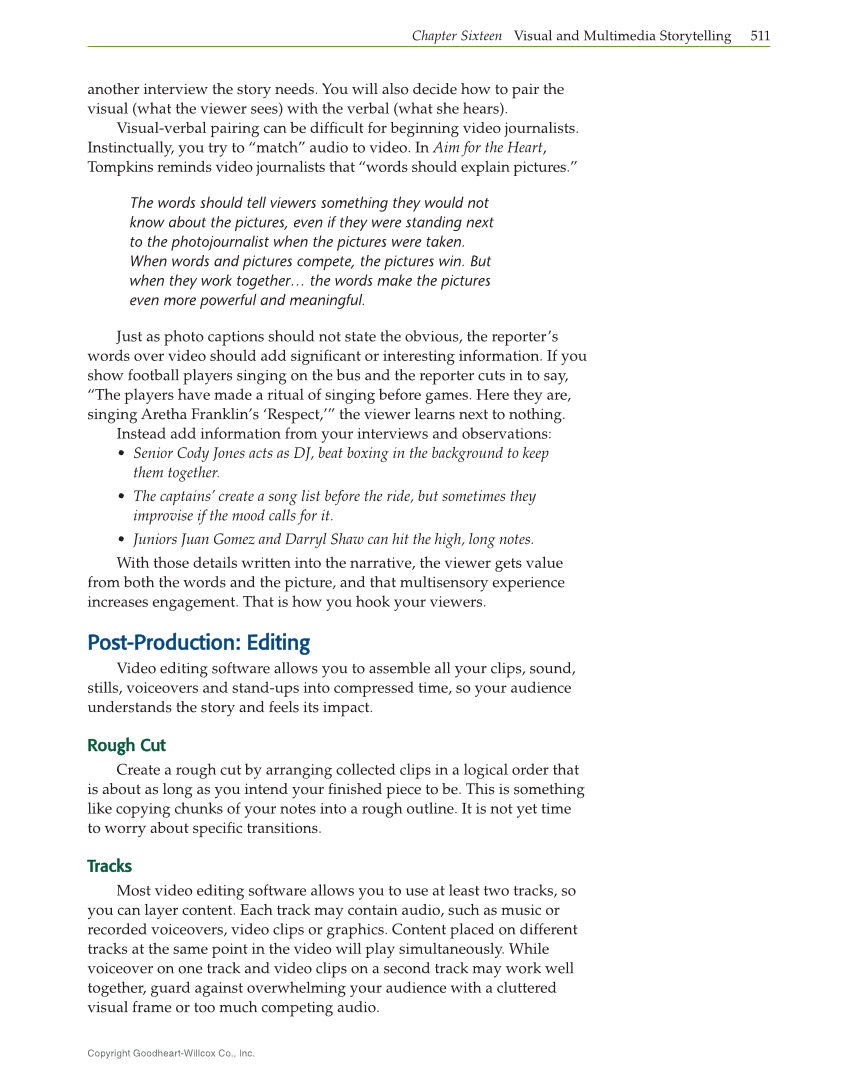 Copyright Goodheart-Willcox Co., Inc. Chapter Sixteen Visual and Multimedia Storytelling 511 another interview the story needs. You will also decide how to pair the visual (what the viewer sees) with the verbal (what she hears). Visual-verbal pairing can be diffi cult for beginning video journalists. Instinctually, you try to “match” audio to video. In Aim for the Heart, Tompkins reminds video journalists that “words should explain pictures.” The words should tell viewers something they would not know about the pictures, even if they were standing next to the photojournalist when the pictures were taken. When words and pictures compete, the pictures win. But when they work together… the words make the pictures even more powerful and meaningful. Just as photo captions should not state the obvious, the reporter’s words over video should add signifi cant or interesting information. If you show football players singing on the bus and the reporter cuts in to say, “The players have made a ritual of singing before games. Here they are, singing Aretha Franklin’s ‘Respect,’” the viewer learns next to nothing. Instead add information from your interviews and observations: • Senior Cody Jones acts as DJ, beat boxing in the background to keep them together. • The captains’ create a song list before the ride, but sometimes they improvise if the mood calls for it. • Juniors Juan Gomez and Darryl Shaw can hit the high, long notes. With those details written into the narrative, the viewer gets value from both the words and the picture, and that multisensory experience increases engagement. That is how you hook your viewers. Post-Production: Editing Post-Production: Editing Video editing software allows you to assemble all your clips, sound, stills, voiceovers and stand-ups into compressed time, so your audience understands the story and feels its impact. Rough Cut Rough Cut Create a rough cut by arranging collected clips in a logical order that is about as long as you intend your fi nished piece to be. This is something like copying chunks of your notes into a rough outline. It is not yet time to worry about specifi c transitions. Tracks Tracks Most video editing software allows you to use at least two tracks, so you can layer content. Each track may contain audio, such as music or recorded voiceovers, video clips or graphics. Content placed on different tracks at the same point in the video will play simultaneously. While voiceover on one track and video clips on a second track may work well together, guard against overwhelming your audience with a cluttered visual frame or too much competing audio.