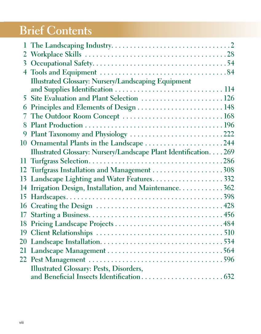 viii Brief Contents 1 The Landscaping Industry. . . . . . . . . . . . . . . . . . . . . . . . . . . . . . . .2 2 Workplace Skills . . . . . . . . . . . . . . . . . . . . . . . . . . . . . . . . . . . . . .28 3 Occupational Safety. . . . . . . . . . . . . . . . . . . . . . . . . . . . . . . . . . . .54 4 Tools and Equipment . . . . . . . . . . . . . . . . . . . . . . . . . . . . . . . . . .84 Illustrated Glossary: Nursery/Landscaping Equipment and Supplies Identifi cation . . . . . . . . . . . . . . . . . . . . . . . . . . . . . 114 5 Site Evaluation and Plant Selection . . . . . . . . . . . . . . . . . . . . . . 126 6 Principles and Elements of Design . . . . . . . . . . . . . . . . . . . . . . . 148 7 The Outdoor Room Concept . . . . . . . . . . . . . . . . . . . . . . . . . . . 168 8 Plant Production . . . . . . . . . . . . . . . . . . . . . . . . . . . . . . . . . . . . . 196 9 Plant Taxonomy and Physiology . . . . . . . . . . . . . . . . . . . . . . . . . 222 10 Ornamental Plants in the Landscape . . . . . . . . . . . . . . . . . . . . .244 Illustrated Glossary: Nursery/Landscape Plant Identifi cation. . . . 269 11 Turfgrass Selection. . . . . . . . . . . . . . . . . . . . . . . . . . . . . . . . . . . .286 12 Turfgrass Installation and Management . . . . . . . . . . . . . . . . . . .308 13 Landscape Lighting and Water Features. . . . . . . . . . . . . . . . . . . 332 14 Irrigation Design, Installation, and Maintenance. . . . . . . . . . . . 362 15 Hardscapes. . . . . . . . . . . . . . . . . . . . . . . . . . . . . . . . . . . . . . . . . . 398 16 Creating the Design . . . . . . . . . . . . . . . . . . . . . . . . . . . . . . . . . . 428 17 Starting a Business. . . . . . . . . . . . . . . . . . . . . . . . . . . . . . . . . . . . 456 18 Pricing Landscape Projects . . . . . . . . . . . . . . . . . . . . . . . . . . . . .484 19 Client Relationships . . . . . . . . . . . . . . . . . . . . . . . . . . . . . . . . . . 510 20 Landscape Installation. . . . . . . . . . . . . . . . . . . . . . . . . . . . . . . . . 534 21 Landscape Management . . . . . . . . . . . . . . . . . . . . . . . . . . . . . . .564 22 Pest Management . . . . . . . . . . . . . . . . . . . . . . . . . . . . . . . . . . . .596 Illustrated Glossary: Pests, Disorders, and Benefi cial Insects Identifi cation. . . . . . . . . . . . . . . . . . . . . . 632