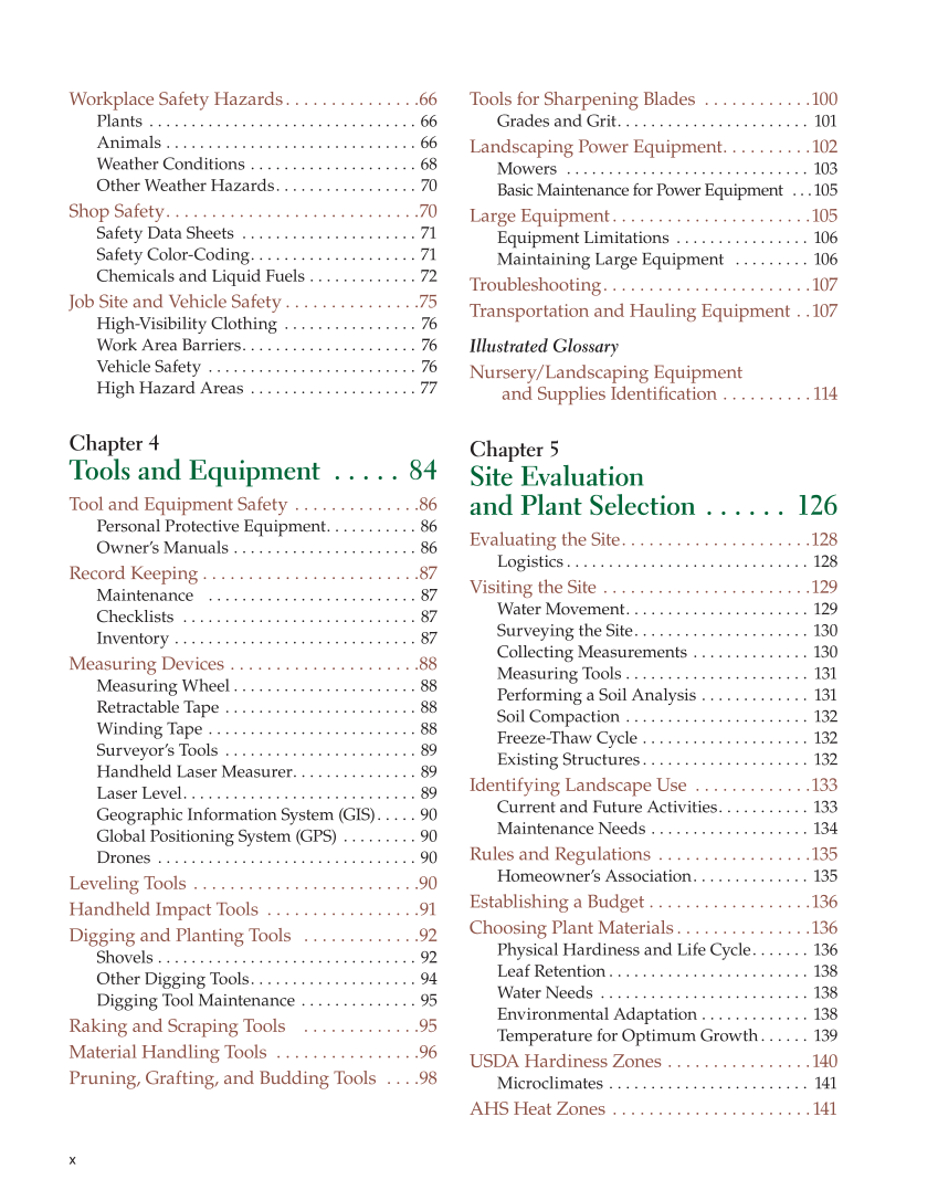 x Workplace Safety Hazards. . . . . . . . . . . . . . .66 Plants . . . . . . . . . . . . . . . . . . . . . . . . . . . . . . . . 66 Animals . . . . . . . . . . . . . . . . . . . . . . . . . . . . . . 66 Weather Conditions . . . . . . . . . . . . . . . . . . . . 68 Other Weather Hazards. . . . . . . . . . . . . . . . . 70 Shop Safety. . . . . . . . . . . . . . . . . . . . . . . . . . . .70 Safety Data Sheets . . . . . . . . . . . . . . . . . . . . . 71 Safety Color-Coding. . . . . . . . . . . . . . . . . . . . 71 Chemicals and Liquid Fuels . . . . . . . . . . . . . 72 Job Site and Vehicle Safety . . . . . . . . . . . . . . .75 High-Visibility Clothing . . . . . . . . . . . . . . . . 76 Work Area Barriers. . . . . . . . . . . . . . . . . . . . . 76 Vehicle Safety . . . . . . . . . . . . . . . . . . . . . . . . . 76 High Hazard Areas . . . . . . . . . . . . . . . . . . . . 77 Chapter 4 Tools and Equipment . . . . . 84 Tool and Equipment Safety . . . . . . . . . . . . . .86 Personal Protective Equipment. . . . . . . . . . . 86 Owner’s Manuals . . . . . . . . . . . . . . . . . . . . . . 86 Record Keeping . . . . . . . . . . . . . . . . . . . . . . . .87 Maintenance . . . . . . . . . . . . . . . . . . . . . . . . . 87 Checklists . . . . . . . . . . . . . . . . . . . . . . . . . . . . 87 Inventory . . . . . . . . . . . . . . . . . . . . . . . . . . . . . 87 Measuring Devices . . . . . . . . . . . . . . . . . . . . .88 Measuring Wheel . . . . . . . . . . . . . . . . . . . . . . 88 Retractable Tape . . . . . . . . . . . . . . . . . . . . . . . 88 Winding Tape . . . . . . . . . . . . . . . . . . . . . . . . . 88 Surveyor’s Tools . . . . . . . . . . . . . . . . . . . . . . . 89 Handheld Laser Measurer. . . . . . . . . . . . . . . 89 Laser Level. . . . . . . . . . . . . . . . . . . . . . . . . . . . 89 Geographic Information System (GIS). . . . . 90 Global Positioning System (GPS) . . . . . . . . . 90 Drones . . . . . . . . . . . . . . . . . . . . . . . . . . . . . . . 90 Leveling Tools . . . . . . . . . . . . . . . . . . . . . . . . .90 Handheld Impact Tools . . . . . . . . . . . . . . . . .91 Digging and Planting Tools . . . . . . . . . . . . .92 Shovels . . . . . . . . . . . . . . . . . . . . . . . . . . . . . . . 92 Other Digging Tools. . . . . . . . . . . . . . . . . . . . 94 Digging Tool Maintenance . . . . . . . . . . . . . . 95 Raking and Scraping Tools . . . . . . . . . . . . .95 Material Handling Tools . . . . . . . . . . . . . . . .96 Pruning, Grafting, and Budding Tools . . . .98 Tools for Sharpening Blades . . . . . . . . . . . .100 Grades and Grit. . . . . . . . . . . . . . . . . . . . . . . 101 Landscaping Power Equipment. . . . . . . . . .102 Mowers . . . . . . . . . . . . . . . . . . . . . . . . . . . . . 103 Basic Maintenance for Power Equipment . . .105 Large Equipment. . . . . . . . . . . . . . . . . . . . . .105 Equipment Limitations . . . . . . . . . . . . . . . . 106 Maintaining Large Equipment . . . . . . . . . 106 Troubleshooting. . . . . . . . . . . . . . . . . . . . . . .107 Transportation and Hauling Equipment . .107 Illustrated Glossary Nursery/Landscaping Equipment and Supplies Identifi cation . . . . . . . . . .114 Chapter 5 Site Evaluation and Plant Selection . . . . . . 126 Evaluating the Site. . . . . . . . . . . . . . . . . . . . .128 Logistics . . . . . . . . . . . . . . . . . . . . . . . . . . . . . 128 Visiting the Site . . . . . . . . . . . . . . . . . . . . . . .129 Water Movement. . . . . . . . . . . . . . . . . . . . . . 129 Surveying the Site. . . . . . . . . . . . . . . . . . . . . 130 Collecting Measurements . . . . . . . . . . . . . . 130 Measuring Tools . . . . . . . . . . . . . . . . . . . . . . 131 Performing a Soil Analysis . . . . . . . . . . . . . 131 Soil Compaction . . . . . . . . . . . . . . . . . . . . . . 132 Freeze-Thaw Cycle . . . . . . . . . . . . . . . . . . . . 132 Existing Structures . . . . . . . . . . . . . . . . . . . . 132 Identifying Landscape Use . . . . . . . . . . . . .133 Current and Future Activities. . . . . . . . . . . 133 Maintenance Needs . . . . . . . . . . . . . . . . . . . 134 Rules and Regulations . . . . . . . . . . . . . . . . .135 Homeowner’s Association. . . . . . . . . . . . . . 135 Establishing a Budget . . . . . . . . . . . . . . . . . .136 Choosing Plant Materials . . . . . . . . . . . . . . .136 Physical Hardiness and Life Cycle. . . . . . . 136 Leaf Retention . . . . . . . . . . . . . . . . . . . . . . . . 138 Water Needs . . . . . . . . . . . . . . . . . . . . . . . . . 138 Environmental Adaptation . . . . . . . . . . . . . 138 Temperature for Optimum Growth . . . . . . 139 USDA Hardiness Zones . . . . . . . . . . . . . . . .140 Microclimates . . . . . . . . . . . . . . . . . . . . . . . . 141 AHS Heat Zones . . . . . . . . . . . . . . . . . . . . . .141