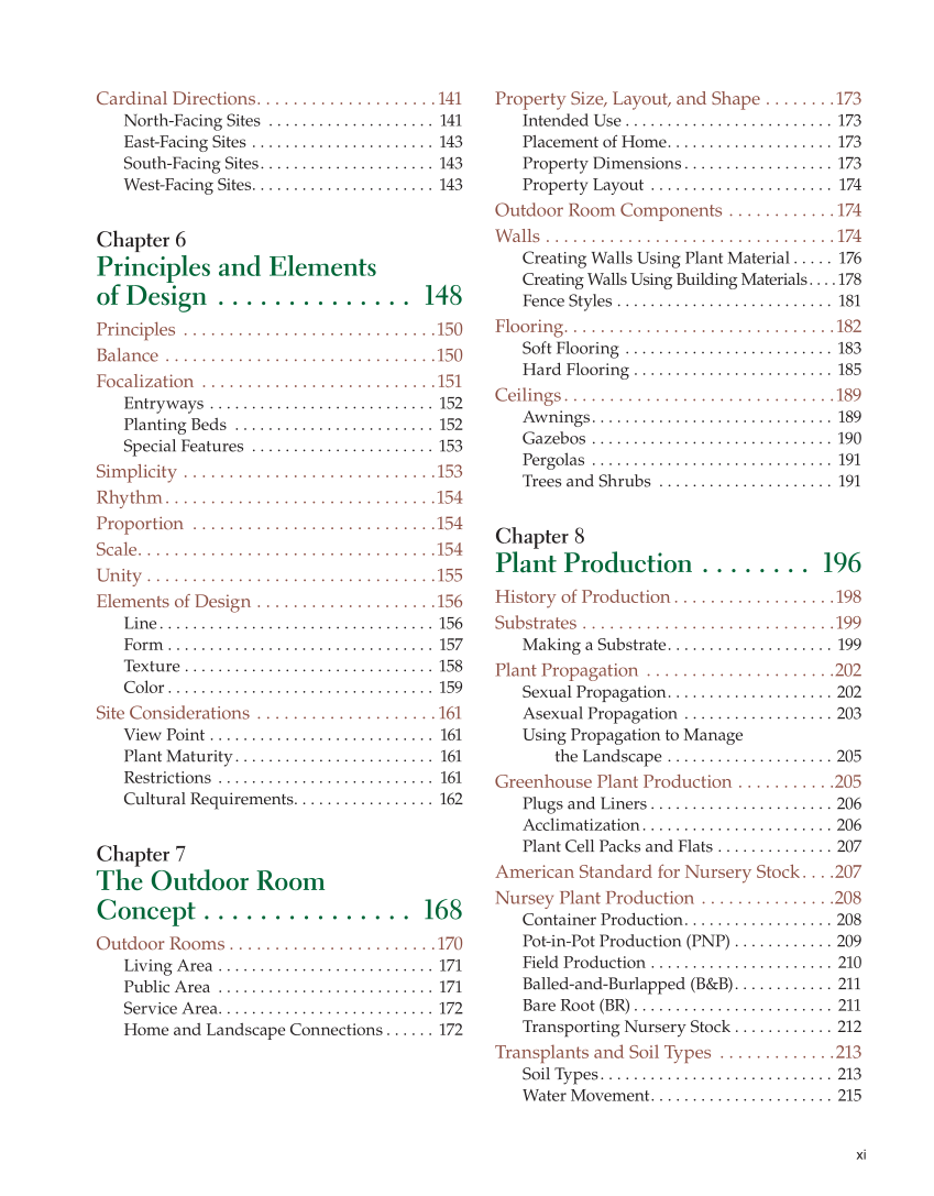xi Cardinal Directions. . . . . . . . . . . . . . . . . . . .141 North-Facing Sites . . . . . . . . . . . . . . . . . . . . 141 East-Facing Sites . . . . . . . . . . . . . . . . . . . . . . 143 South-Facing Sites. . . . . . . . . . . . . . . . . . . . . 143 West-Facing Sites. . . . . . . . . . . . . . . . . . . . . . 143 Chapter 6 Principles and Elements of Design . . . . . . . . . . . . . . 148 Principles . . . . . . . . . . . . . . . . . . . . . . . . . . . .150 Balance . . . . . . . . . . . . . . . . . . . . . . . . . . . . . .150 Focalization . . . . . . . . . . . . . . . . . . . . . . . . . .151 Entryways . . . . . . . . . . . . . . . . . . . . . . . . . . . 152 Planting Beds . . . . . . . . . . . . . . . . . . . . . . . . 152 Special Features . . . . . . . . . . . . . . . . . . . . . . 153 Simplicity . . . . . . . . . . . . . . . . . . . . . . . . . . . .153 Rhythm. . . . . . . . . . . . . . . . . . . . . . . . . . . . . .154 Proportion . . . . . . . . . . . . . . . . . . . . . . . . . . .154 Scale. . . . . . . . . . . . . . . . . . . . . . . . . . . . . . . . .154 Unity . . . . . . . . . . . . . . . . . . . . . . . . . . . . . . . .155 Elements of Design . . . . . . . . . . . . . . . . . . . .156 Line. . . . . . . . . . . . . . . . . . . . . . . . . . . . . . . . . 156 Form . . . . . . . . . . . . . . . . . . . . . . . . . . . . . . . . 157 Texture . . . . . . . . . . . . . . . . . . . . . . . . . . . . . . 158 Color . . . . . . . . . . . . . . . . . . . . . . . . . . . . . . . . 159 Site Considerations . . . . . . . . . . . . . . . . . . . .161 View Point . . . . . . . . . . . . . . . . . . . . . . . . . . . 161 Plant Maturity. . . . . . . . . . . . . . . . . . . . . . . . 161 Restrictions . . . . . . . . . . . . . . . . . . . . . . . . . . 161 Cultural Requirements. . . . . . . . . . . . . . . . . 162 Chapter 7 The Outdoor Room Concept . . . . . . . . . . . . . . . 168 Outdoor Rooms . . . . . . . . . . . . . . . . . . . . . . .170 Living Area . . . . . . . . . . . . . . . . . . . . . . . . . . 171 Public Area . . . . . . . . . . . . . . . . . . . . . . . . . . 171 Service Area. . . . . . . . . . . . . . . . . . . . . . . . . . 172 Home and Landscape Connections . . . . . . 172 Property Size, Layout, and Shape . . . . . . . .173 Intended Use . . . . . . . . . . . . . . . . . . . . . . . . . 173 Placement of Home. . . . . . . . . . . . . . . . . . . . 173 Property Dimensions . . . . . . . . . . . . . . . . . . 173 Property Layout . . . . . . . . . . . . . . . . . . . . . . 174 Outdoor Room Components . . . . . . . . . . . .174 Walls . . . . . . . . . . . . . . . . . . . . . . . . . . . . . . . .174 Creating Walls Using Plant Material . . . . . 176 Creating Walls Using Building Materials. . . .178 Fence Styles . . . . . . . . . . . . . . . . . . . . . . . . . . 181 Flooring. . . . . . . . . . . . . . . . . . . . . . . . . . . . . .182 Soft Flooring . . . . . . . . . . . . . . . . . . . . . . . . . 183 Hard Flooring . . . . . . . . . . . . . . . . . . . . . . . . 185 Ceilings. . . . . . . . . . . . . . . . . . . . . . . . . . . . . .189 Awnings. . . . . . . . . . . . . . . . . . . . . . . . . . . . . 189 Gazebos . . . . . . . . . . . . . . . . . . . . . . . . . . . . . 190 Pergolas . . . . . . . . . . . . . . . . . . . . . . . . . . . . . 191 Trees and Shrubs . . . . . . . . . . . . . . . . . . . . . 191 Chapter 8 Plant Production . . . . . . . . 196 History of Production . . . . . . . . . . . . . . . . . .198 Substrates . . . . . . . . . . . . . . . . . . . . . . . . . . . .199 Making a Substrate. . . . . . . . . . . . . . . . . . . . 199 Plant Propagation . . . . . . . . . . . . . . . . . . . . .202 Sexual Propagation. . . . . . . . . . . . . . . . . . . . 202 Asexual Propagation . . . . . . . . . . . . . . . . . . 203 Using Propagation to Manage the Landscape . . . . . . . . . . . . . . . . . . . . 205 Greenhouse Plant Production . . . . . . . . . . .205 Plugs and Liners . . . . . . . . . . . . . . . . . . . . . . 206 Acclimatization. . . . . . . . . . . . . . . . . . . . . . . 206 Plant Cell Packs and Flats . . . . . . . . . . . . . . 207 American Standard for Nursery Stock. . . .207 Nursey Plant Production . . . . . . . . . . . . . . .208 Container Production. . . . . . . . . . . . . . . . . . 208 Pot-in-Pot Production (PNP) . . . . . . . . . . . . 209 Field Production . . . . . . . . . . . . . . . . . . . . . . 210 Balled-and-Burlapped (B&B). . . . . . . . . . . . 211 Bare Root (BR) . . . . . . . . . . . . . . . . . . . . . . . . 211 Transporting Nursery Stock . . . . . . . . . . . . 212 Transplants and Soil Types . . . . . . . . . . . . .213 Soil Types. . . . . . . . . . . . . . . . . . . . . . . . . . . . 213 Water Movement. . . . . . . . . . . . . . . . . . . . . . 215