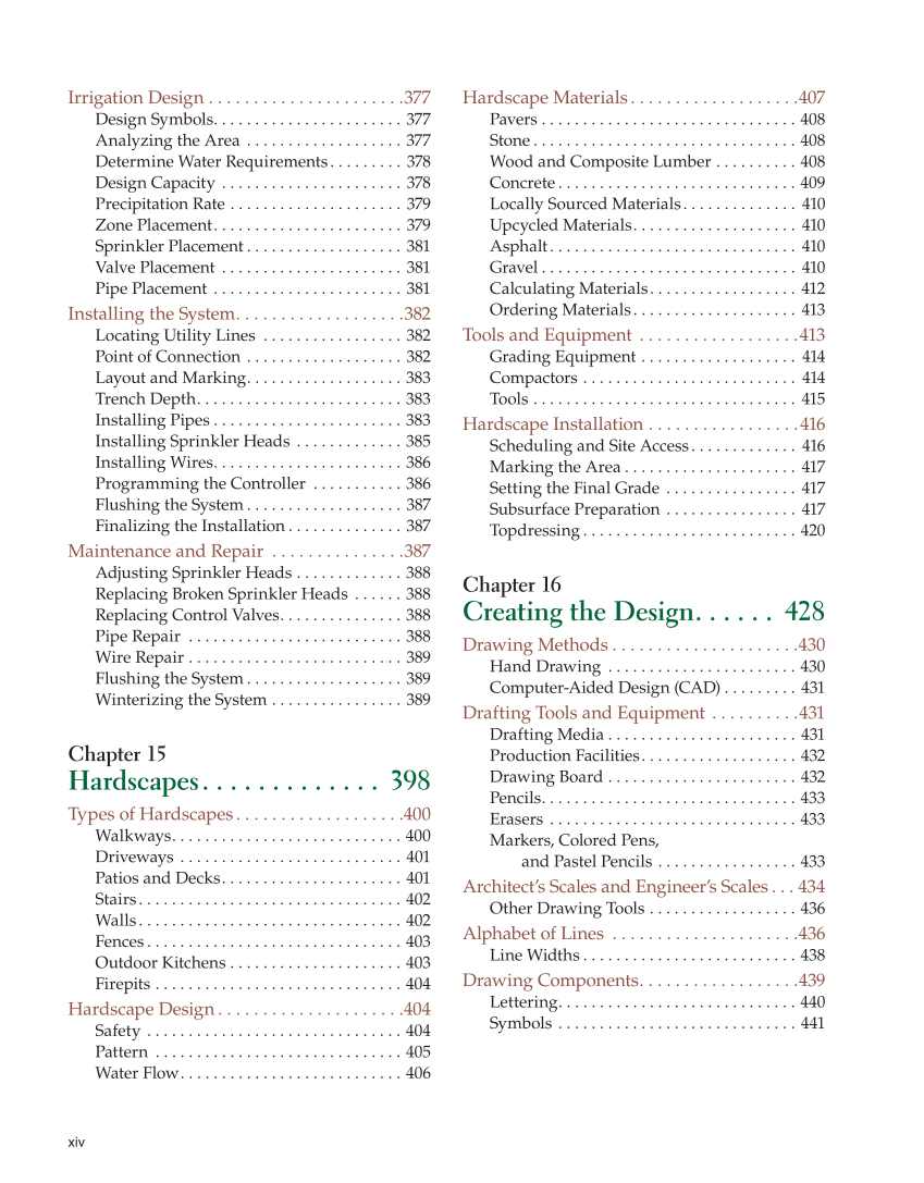 xiv Irrigation Design . . . . . . . . . . . . . . . . . . . . . .377 Design Symbols. . . . . . . . . . . . . . . . . . . . . . . 377 Analyzing the Area . . . . . . . . . . . . . . . . . . . 377 Determine Water Requirements. . . . . . . . . 378 Design Capacity . . . . . . . . . . . . . . . . . . . . . . 378 Precipitation Rate . . . . . . . . . . . . . . . . . . . . . 379 Zone Placement. . . . . . . . . . . . . . . . . . . . . . . 379 Sprinkler Placement . . . . . . . . . . . . . . . . . . . 381 Valve Placement . . . . . . . . . . . . . . . . . . . . . . 381 Pipe Placement . . . . . . . . . . . . . . . . . . . . . . . 381 Installing the System. . . . . . . . . . . . . . . . . . .382 Locating Utility Lines . . . . . . . . . . . . . . . . . 382 Point of Connection . . . . . . . . . . . . . . . . . . . 382 Layout and Marking. . . . . . . . . . . . . . . . . . . 383 Trench Depth. . . . . . . . . . . . . . . . . . . . . . . . . 383 Installing Pipes . . . . . . . . . . . . . . . . . . . . . . . 383 Installing Sprinkler Heads . . . . . . . . . . . . . 385 Installing Wires. . . . . . . . . . . . . . . . . . . . . . . 386 Programming the Controller . . . . . . . . . . . 386 Flushing the System . . . . . . . . . . . . . . . . . . . 387 Finalizing the Installation . . . . . . . . . . . . . . 387 Maintenance and Repair . . . . . . . . . . . . . . .387 Adjusting Sprinkler Heads . . . . . . . . . . . . . 388 Replacing Broken Sprinkler Heads . . . . . . 388 Replacing Control Valves. . . . . . . . . . . . . . . 388 Pipe Repair . . . . . . . . . . . . . . . . . . . . . . . . . . 388 Wire Repair . . . . . . . . . . . . . . . . . . . . . . . . . . 389 Flushing the System . . . . . . . . . . . . . . . . . . . 389 Winterizing the System . . . . . . . . . . . . . . . . 389 Chapter 15 Hardscapes. . . . . . . . . . . . . 398 Types of Hardscapes. . . . . . . . . . . . . . . . . . .400 Walkways. . . . . . . . . . . . . . . . . . . . . . . . . . . . 400 Driveways . . . . . . . . . . . . . . . . . . . . . . . . . . . 401 Patios and Decks. . . . . . . . . . . . . . . . . . . . . . 401 Stairs. . . . . . . . . . . . . . . . . . . . . . . . . . . . . . . . 402 Walls. . . . . . . . . . . . . . . . . . . . . . . . . . . . . . . . 402 Fences . . . . . . . . . . . . . . . . . . . . . . . . . . . . . . . 403 Outdoor Kitchens . . . . . . . . . . . . . . . . . . . . . 403 Firepits . . . . . . . . . . . . . . . . . . . . . . . . . . . . . . 404 Hardscape Design . . . . . . . . . . . . . . . . . . . . .404 Safety . . . . . . . . . . . . . . . . . . . . . . . . . . . . . . . 404 Pattern . . . . . . . . . . . . . . . . . . . . . . . . . . . . . . 405 Water Flow. . . . . . . . . . . . . . . . . . . . . . . . . . . 406 Hardscape Materials. . . . . . . . . . . . . . . . . . .407 Pavers . . . . . . . . . . . . . . . . . . . . . . . . . . . . . . . 408 Stone . . . . . . . . . . . . . . . . . . . . . . . . . . . . . . . . 408 Wood and Composite Lumber . . . . . . . . . . 408 Concrete . . . . . . . . . . . . . . . . . . . . . . . . . . . . . 409 Locally Sourced Materials. . . . . . . . . . . . . . 410 Upcycled Materials. . . . . . . . . . . . . . . . . . . . 410 Asphalt. . . . . . . . . . . . . . . . . . . . . . . . . . . . . . 410 Gravel . . . . . . . . . . . . . . . . . . . . . . . . . . . . . . . 410 Calculating Materials. . . . . . . . . . . . . . . . . . 412 Ordering Materials. . . . . . . . . . . . . . . . . . . . 413 Tools and Equipment . . . . . . . . . . . . . . . . . .413 Grading Equipment . . . . . . . . . . . . . . . . . . . 414 Compactors . . . . . . . . . . . . . . . . . . . . . . . . . . 414 Tools . . . . . . . . . . . . . . . . . . . . . . . . . . . . . . . . 415 Hardscape Installation . . . . . . . . . . . . . . . . .416 Scheduling and Site Access. . . . . . . . . . . . . 416 Marking the Area . . . . . . . . . . . . . . . . . . . . . 417 Setting the Final Grade . . . . . . . . . . . . . . . . 417 Subsurface Preparation . . . . . . . . . . . . . . . . 417 Topdressing . . . . . . . . . . . . . . . . . . . . . . . . . . 420 Chapter 16 Creating the Design. . . . . . 428 Drawing Methods . . . . . . . . . . . . . . . . . . . . .430 Hand Drawing . . . . . . . . . . . . . . . . . . . . . . . 430 Computer-Aided Design (CAD) . . . . . . . . . 431 Drafting Tools and Equipment . . . . . . . . . .431 Drafting Media . . . . . . . . . . . . . . . . . . . . . . . 431 Production Facilities. . . . . . . . . . . . . . . . . . . 432 Drawing Board . . . . . . . . . . . . . . . . . . . . . . . 432 Pencils. . . . . . . . . . . . . . . . . . . . . . . . . . . . . . . 433 Erasers . . . . . . . . . . . . . . . . . . . . . . . . . . . . . . 433 Markers, Colored Pens, and Pastel Pencils . . . . . . . . . . . . . . . . . 433 Architect’s Scales and Engineer’s Scales . . . 434 Other Drawing Tools . . . . . . . . . . . . . . . . . . 436 Alphabet of Lines . . . . . . . . . . . . . . . . . . . . .436 Line Widths . . . . . . . . . . . . . . . . . . . . . . . . . . 438 Drawing Components. . . . . . . . . . . . . . . . . .439 Lettering. . . . . . . . . . . . . . . . . . . . . . . . . . . . . 440 Symbols . . . . . . . . . . . . . . . . . . . . . . . . . . . . . 441