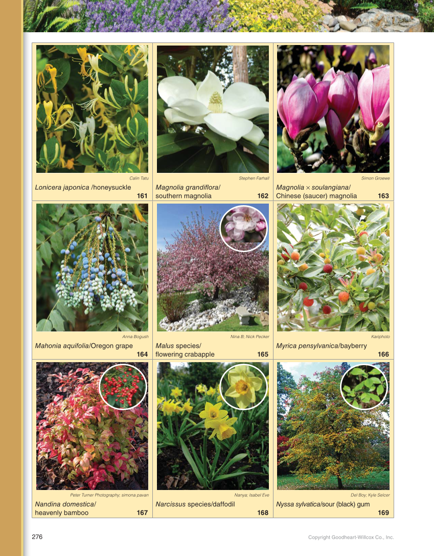 Copyright Goodheart-Willcox Co., Inc. 276 Calin Tatu Lonicera japonica /honeysuckle 161 Stephen Farhall Magnolia grandiflora/ southern magnolia 162 Simon Groewe Magnolia × soulangiana/ Chinese (saucer) magnolia 163 Anna Bogush Mahonia aquifolia/Oregon grape 164 Nina B Nick Pecker Malus species/ flowering crabapple 165 Kariphoto Myrica pensylvanica/bayberry 166 Peter Turner Photography simona pavan Nandina domestica/ heavenly bamboo 167 Nanya Isabel Eve Narcissus species/daffodil 168 Del Boy Kyle Selcer Nyssa sylvatica/sour (black) gum 169