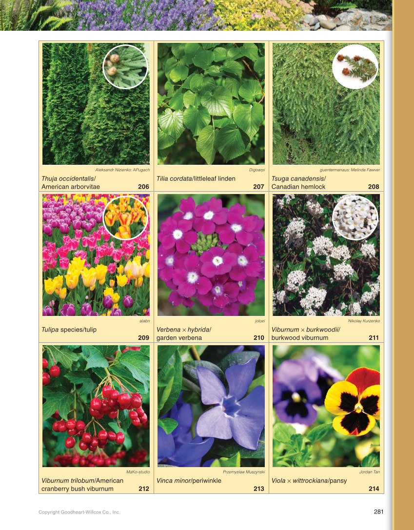 Copyright Goodheart-Willcox Co., Inc. 281 Aleksandr Nizienko APugach Thuja occidentalis/ American arborvitae 206 Digoarpi Tilia cordata/littleleaf linden 207 guentermanaus Melinda Fawver Tsuga canadensis/ Canadian hemlock 208 alabn Tulipa species/tulip 209 joloei Verbena × hybrida/ garden verbena 210 Nikolay Kurzenko Viburnum × burkwoodii/ burkwood viburnum 211 MaKo-studio Viburnum trilobum/American cranberry bush viburnum 212 Przemyslaw Muszynski Vinca minor/periwinkle 213 Jordan Tan Viola × wittrockiana/pansy 214
