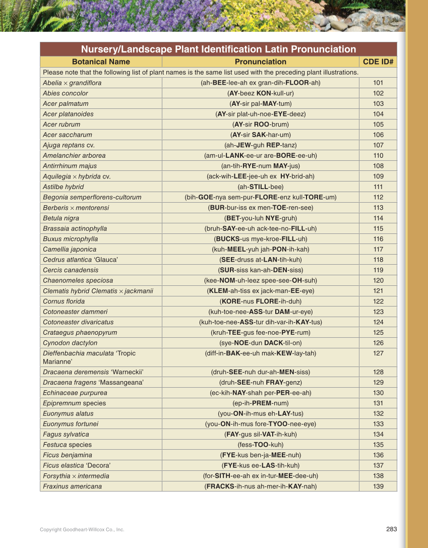 Copyright Goodheart-Willcox Co., Inc. 283 Nursery/Landscape Plant Identification Latin Pronunciation Botanical Name Pronunciation CDE ID# Please note that the following list of plant names is the same list used with the preceding plant illustrations. Abelia × grandiflora (ah-BEE-lee-ah ex gran-dih-FLOOR-ah) 101 Abies concolor (AY-beez KON-kull-ur) 102 Acer palmatum (AY-sir pal-MAY-tum) 103 Acer platanoides (AY-sir plat-uh-noe-EYE-deez) 104 Acer rubrum (AY-sir ROO-brum) 105 Acer saccharum (AY-sir SAK-har-um) 106 Ajuga reptans cv. (ah-JEW-guh REP-tanz) 107 Amelanchier arborea (am-ul-LANK-ee-ur are-BORE-ee-uh) 110 Antirrhinum majus (an-tih-RYE-num MAY-jus) 108 Aquilegia × hybrida cv. (ack-wih-LEE-jee-uh ex HY-brid-ah) 109 Astilbe hybrid (ah-STILL-bee) 111 Begonia semperflorens-cultorum (bih-GOE-nya sem-pur-FLORE-enz kull-TORE-um) 112 Berberis × mentorensi (BUR-bur-iss ex men-TOE-ren-see) 113 Betula nigra (BET-you-luh NYE-gruh) 114 Brassaia actinophylla (bruh-SAY-ee-uh ack-tee-no-FILL-uh) 115 Buxus microphylla (BUCKS-us mye-kroe-FILL-uh) 116 Camellia japonica (kuh-MEEL-yuh jah-PON-ih-kah) 117 Cedrus atlantica ‘Glauca’ (SEE-druss at-LAN-tih-kuh) 118 Cercis canadensis (SUR-siss kan-ah-DEN-siss) 119 Chaenomeles speciosa (kee-NOM-uh-leez spee-see-OH-suh) 120 Clematis hybrid Clematis × jackmanii (KLEM-ah-tiss ex jack-man-EE-eye) 121 Cornus florida (KORE-nus FLORE-ih-duh) 122 Cotoneaster dammeri (kuh-toe-nee-ASS-tur DAM-ur-eye) 123 Cotoneaster divaricatus (kuh-toe-nee-ASS-tur dih-var-ih-KAY-tus) 124 Crataegus phaenopyrum (kruh-TEE-gus fee-noe-PYE-rum) 125 Cynodon dactylon (sye-NOE-dun DACK-til-on) 126 Dieffenbachia maculata ‘Tropic Marianne’ (diff-in-BAK-ee-uh mak-KEW-lay-tah) 127 Dracaena deremensis ‘Warneckii’ (druh-SEE-nuh dur-ah-MEN-siss) 128 Dracaena fragens ‘Massangeana’ (druh-SEE-nuh FRAY-genz) 129 Echinaceae purpurea (ec-kih-NAY-shah per-PER-ee-ah) 130 Epipremnum species (ep-ih-PREM-num) 131 Euonymus alatus (you-ON-ih-mus eh-LAY-tus) 132 Euonymus fortunei (you-ON-ih-mus fore-TYOO-nee-eye) 133 Fagus sylvatica (FAY-gus sil-VAT-ih-kuh) 134 Festuca species (fess-TOO-kuh) 135 Ficus benjamina (FYE-kus ben-ja-MEE-nuh) 136 Ficus elastica ‘Decora’ (FYE-kus ee-LAS-tih-kuh) 137 Forsythia × intermedia (for-SITH-ee-ah ex in-tur-MEE-dee-uh) 138 Fraxinus americana (FRACKS-ih-nus ah-mer-ih-KAY-nah) 139