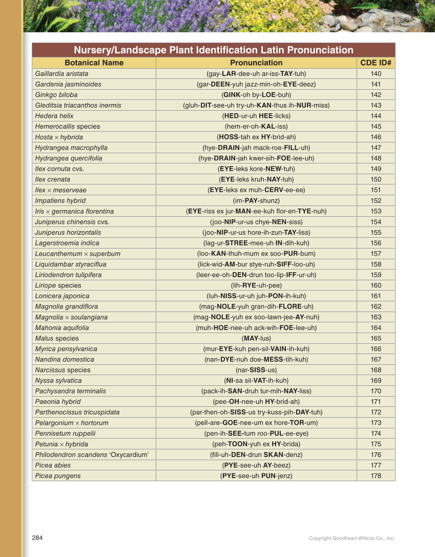 Copyright Goodheart-Willcox Co., Inc. 284 Nursery/Landscape Plant Identification Latin Pronunciation Botanical Name Pronunciation CDE ID# Gaillardia aristata (gay-LAR-dee-uh ar-iss-TAY-tuh) 140 Gardenia jasminoides (gar-DEEN-yuh jazz-min-oh-EYE-deez) 141 Ginkgo biloba (GINK-oh by-LOE-buh) 142 Gleditsia triacanthos inermis (gluh-DIT-see-uh try-uh-KAN-thus ih-NUR-miss) 143 Hedera helix (HED-ur-uh HEE-licks) 144 Hemerocallis species (hem-er-oh-KAL-iss) 145 Hosta × hybrida (HOSS-tah ex HY-brid-ah) 146 Hydrangea macrophylla (hye-DRAIN-jah mack-roe-FILL-uh) 147 Hydrangea quercifolia (hye-DRAIN-jah kwer-sih-FOE-lee-uh) 148 Ilex cornuta cvs. (EYE-leks kore-NEW-tuh) 149 Ilex crenata (EYE-leks kruh-NAY-tuh) 150 Ilex × meserveae (EYE-leks ex muh-CERV-ee-ee) 151 Impatiens hybrid (im-PAY-shunz) 152 Iris × germanica florentina (EYE-riss ex jur-MAN-ee-kuh flor-en-TYE-nuh) 153 Juniperus chinensis cvs. (joo-NIP-ur-us chye-NEN-siss) 154 Juniperus horizontalis (joo-NIP-ur-us hore-ih-zun-TAY-liss) 155 Lagerstroemia indica (lag-ur-STREE-mee-uh IN-dih-kuh) 156 Leucanthemum × superbum (loo-KAN-thuh-mum ex soo-PUR-bum) 157 Liquidambar styraciflua (lick-wid-AM-bur stye-ruh-SIFF-loo-uh) 158 Liriodendron tulipifera (leer-ee-oh-DEN-drun too-lip-IFF-ur-uh) 159 Liriope species (lih-RYE-uh-pee) 160 Lonicera japonica (luh-NISS-ur-uh juh-PON-ih-kuh) 161 Magnolia grandiflora (mag-NOLE-yuh gran-dih-FLORE-uh) 162 Magnolia × soulangiana (mag-NOLE-yuh ex soo-lawn-jee-AY-nuh) 163 Mahonia aquifolia (muh-HOE-nee-uh ack-wih-FOE-lee-uh) 164 Malus species (MAY-lus) 165 Myrica pensylvanica (mur-EYE-kuh pen-sil-VAIN-ih-kuh) 166 Nandina domestica (nan-DYE-nuh doe-MESS-tih-kuh) 167 Narcissus species (nar-SISS-us) 168 Nyssa sylvatica (NI-sa sil-VAT-ih-kuh) 169 Pachysandra terminalis (pack-ih-SAN-druh tur-mih-NAY-liss) 170 Paeonia hybrid (pee-OH-nee-uh HY-brid-ah) 171 Parthenocissus tricuspidata (par-then-oh-SISS-us try-kuss-pih-DAY-tuh) 172 Pelargonium × hortorum (pell-are-GOE-nee-um ex hore-TOR-um) 173 Pennisetum ruppelii (pen-ih-SEE-tum roo-PUL-ee-eye) 174 Petunia × hybrida (peh-TOON-yuh ex HY-brida) 175 Philodendron scandens ‘Oxycardium’ (fill-uh-DEN-drun SKAN-denz) 176 Picea abies (PYE-see-uh AY-beez) 177 Picea pungens (PYE-see-uh PUN-jenz) 178