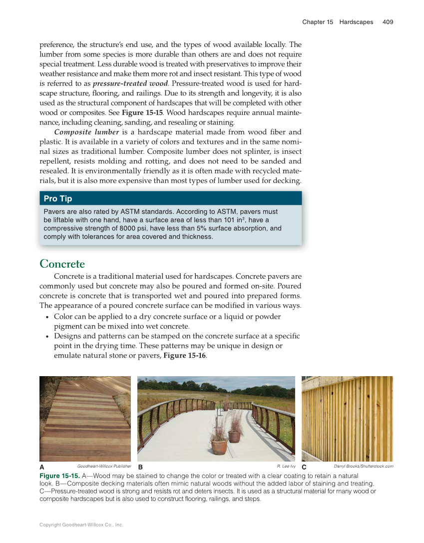 Chapter 15 Hardscapes 409 Copyright Goodheart-Willcox Co., Inc. preference, the structure’s end use, and the types of wood available locally. The lumber from some species is more durable than others are and does not require special treatment. Less durable wood is treated with preservatives to improve their weather resistance and make them more rot and insect resistant. This type of wood is referred to as pressure-treated wood. Pressure-treated wood is used for hard- scape structure, fl ooring, and railings. Due to its strength and longevity, it is also used as the structural component of hardscapes that will be completed with other wood or composites. See Figure 15-15. Wood hardscapes require annual mainte- nance, including cleaning, sanding, and resealing or staining. Composite lumber is a hardscape material made from wood fi ber and plastic. It is available in a variety of colors and textures and in the same nomi- nal sizes as traditional lumber. Composite lumber does not splinter, is insect repellent, resists molding and rotting, and does not need to be sanded and resealed. It is environmentally friendly as it is often made with recycled mate- rials, but it is also more expensive than most types of lumber used for decking. Concrete Concrete is a traditional material used for hardscapes. Concrete pavers are commonly used but concrete may also be poured and formed on-site. Poured concrete is concrete that is transported wet and poured into prepared forms. The appearance of a poured concrete surface can be modifi ed in various ways. • Color can be applied to a dry concrete surface or a liquid or powder pigment can be mixed into wet concrete. • Designs and patterns can be stamped on the concrete surface at a specifi c point in the drying time. These patterns may be unique in design or emulate natural stone or pavers, Figure 15-16. Pro Tip Pavers are also rated by ASTM standards. According to ASTM, pavers must be liftable with one hand, have a surface area of less than 101 in2, have a compressive strength of 8000 psi, have less than 5% surface absorption, and comply with tolerances for area covered and thickness. Darryl Brooks/Shutterstock.com Figure 15-15. A—Wood may be stained to change the color or treated with a clear coating to retain a natural look. B—Composite decking materials often mimic natural woods without the added labor of staining and treating. C—Pressure-treated wood is strong and resists rot and deters insects. It is used as a structural material for many wood or composite hardscapes but is also used to construct flooring, railings, and steps. R. Lee Ivy Goodheart-Willcox Publisher A B C