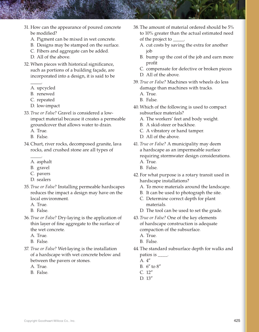 Copyright Goodheart-Willcox Co., Inc. 425 31. How can the appearance of poured concrete be modifi ed? A. Pigment can be mixed in wet concrete. B. Designs may be stamped on the surface. C. Fibers and aggregate can be added. D. All of the above. 32. When pieces with historical signifi cance, such as portions of a building façade, are incorporated into a design, it is said to be _____. A. upcycled B. renewed C. repeated D. low-impact 33. True or False? Gravel is considered a low- impact material because it creates a permeable groundcover that allows water to drain. A. True. B. False. 34. Churt, river rocks, decomposed granite, lava rocks, and crushed stone are all types of _____. A. asphalt B. gravel C. pavers D. sealers 35. True or False? Installing permeable hardscapes reduces the impact a design may have on the local environment. A. True. B. False. 36. True or False? Dry-laying is the application of thin layer of fi ne aggregate to the surface of the wet concrete. A. True. B. False. 37. True or False? Wet-laying is the installation of a hardscape with wet concrete below and between the pavers or stones. A. True. B. False. 38. The amount of material ordered should be 5% to 10% greater than the actual estimated need of the project to _____. A. cut costs by saving the extra for another job B. bump up the cost of the job and earn more profi t C. compensate for defective or broken pieces D. All of the above. 39. True or False? Machines with wheels do less damage than machines with tracks. A. True. B. False. 40. Which of the following is used to compact subsurface materials? A. The workers’ feet and body weight. B. A skid-steer or backhoe. C. A vibratory or hand tamper. D. All of the above. 41. True or False? A municipality may deem a hardscape as an impermeable surface requiring stormwater design considerations. A. True. B. False. 42. For what purpose is a rotary transit used in hardscape installations? A. To move materials around the landscape. B. It can be used to photograph the site. C. Determine correct depth for plant materials. D. The tool can be used to set the grade. 43. True or False? One of the key elements of hardscape construction is adequate compaction of the subsurface. A. True. B. False. 44. The standard subsurface depth for walks and patios is ____. A. 4″ B. 6″ to 8″ C. 12″ D. 13″