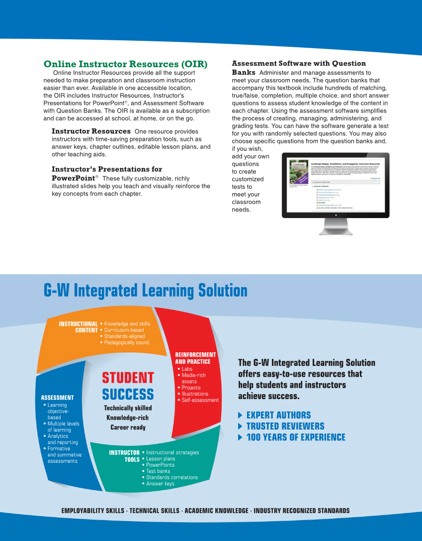 EMPLOYABILITY SKILLS ∙ TECHNICAL SKILLS ∙ ACADEMIC KNOWLEDGE ∙ INDUSTRY RECOGNIZED STANDARDS The G-W Integrated Learning Solution offers easy-to-use resources that help students and instructors achieve success. EXPERT AUTHORS TRUSTED REVIEWERS 100 YEARS OF EXPERIENCE G-W Integrated Learning Solution ASSESSMENT • Learning objective- based • Multiple levels of learning • Analytics and reporting • Formative and summative assessments • Knowledge and skills • Curriculum-based • Standards-aligned • Pedagogically sound INSTRUCTIONAL CONTENT INSTRUCTOR TOOLS • Instructional strategies • Lesson plans • PowerPoints • Test banks • Standards correlations • Answer keys REINFORCEMENT AND PRACTICE • Labs • Media-rich assets • Projects • Illustrations • Self-assessment STUDENT SUCCESS Technically skilled Knowledge-rich Career ready Online Instructor Resources (OIR) Online Instructor Resources provide all the support needed to make preparation and classroom instruction easier than ever. Available in one accessible location, the OIR includes Instructor Resources, Instructor’s Presentations for PowerPoint®, and Assessment Software with Question Banks. The OIR is available as a subscription and can be accessed at school, at home, or on the go. Instructor Resources One resource provides instructors with time-saving preparation tools, such as answer keys, chapter outlines, editable lesson plans, and other teaching aids. Instructor’s Presentations for PowerPoint® These fully customizable, richly illustrated slides help you teach and visually reinforce the key concepts from each chapter. Assessment Software with Question Banks Administer and manage assessments to meet your classroom needs. The question banks that accompany this textbook include hundreds of matching, true/false, completion, multiple choice, and short answer questions to assess student knowledge of the content in each chapter. Using the assessment software simplifies the process of creating, managing, administering, and grading tests. You can have the software generate a test for you with randomly selected questions. You may also choose specific questions from the question banks and, if you wish, add your own questions to create customized tests to meet your classroom needs.