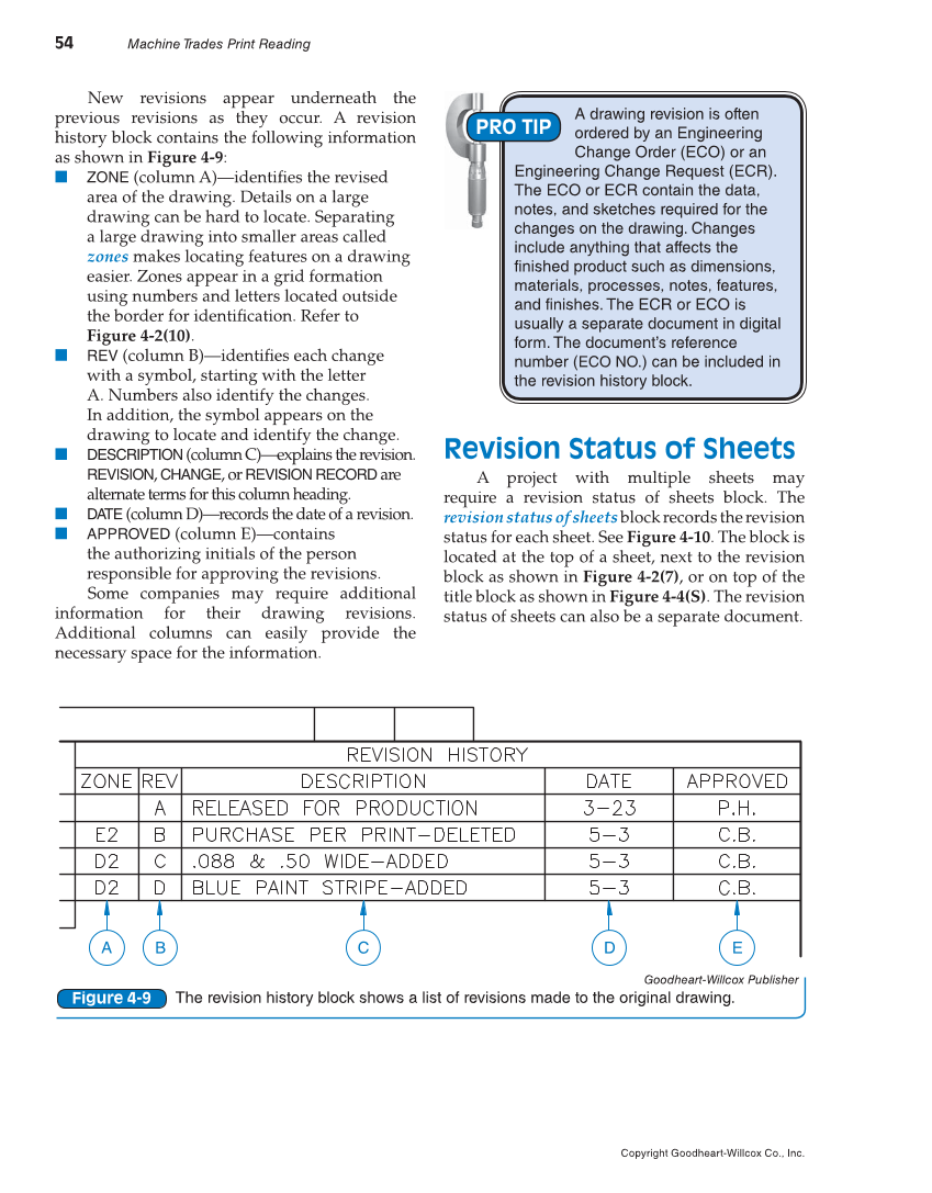 54 Machine Trades Print Reading Copyright Goodheart-Willcox Co., Inc. New revisions appear underneath the previous revisions as they occur. A revision history block contains the following information as shown in Figure 4-9: ■ ZONE (column A)—identifi es the revised area of the drawing. Details on a large drawing can be hard to locate. Separating a large drawing into smaller areas called zones makes locating features on a drawing easier. Zones appear in a grid formation using numbers and letters located outside the border for identifi cation. Refer to Figure 4-2(10). ■ REV (column B)—identifi es each change with a symbol, starting with the letter A. Numbers also identify the changes. In addition, the symbol appears on the drawing to locate and identify the change. ■ DESCRIPTION (column C)—explains the revision. REVISION, CHANGE, or REVISION RECORD are alternate terms for this column heading. ■ DATE (column D)—records the date of a revision. ■ APPROVED (column E)—contains the authorizing initials of the person responsible for approving the revisions. Some companies may require additional information for their drawing revisions. Additional columns can easily provide the necessary space for the information. Revision Status of Sheets A project with multiple sheets may require a revision status of sheets block. The revision status of sheets block records the revision status for each sheet. See Figure 4-10. The block is located at the top of a sheet, next to the revision block as shown in Figure 4-2(7), or on top of the title block as shown in Figure 4-4(S). The revision status of sheets can also be a separate document. Goodheart-Willcox Publisher The revision history block shows a list of revisions made to the original drawing. Figure 4-9 A B C D E A drawing revision is often ordered by an Engineering Change Order (ECO) or an Engineering Change Request (ECR). The ECO or ECR contain the data, notes, and sketches required for the changes on the drawing. Changes include anything that affects the finished product such as dimensions, materials, processes, notes, features, and finishes. The ECR or ECO is usually a separate document in digital form. The document’s reference number (ECO NO.) can be included in the revision history block. PRO TIP