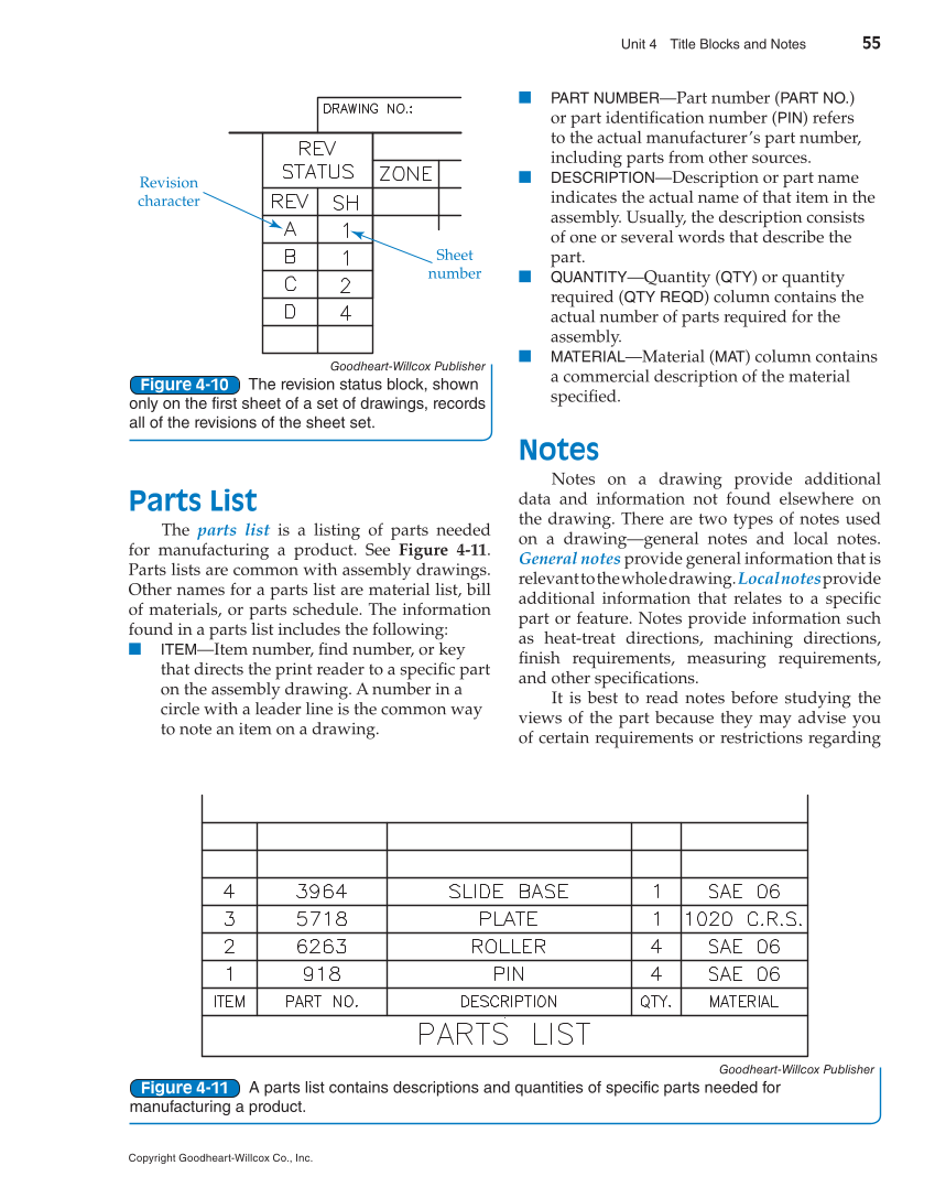 Unit 4 Title Blocks and Notes 55 Copyright Goodheart-Willcox Co., Inc. Parts List The parts list is a listing of parts needed for manufacturing a product. See Figure 4-11. Parts lists are common with assembly drawings. Other names for a parts list are material list, bill of materials, or parts schedule. The information found in a parts list includes the following: ■ ITEM—Item number, fi nd number, or key that directs the print reader to a specifi c part on the assembly drawing. A number in a circle with a leader line is the common way to note an item on a drawing. ■ PART NUMBER—Part number (PART NO.) or part identifi cation number (PIN) refers to the actual manufacturer’s part number, including parts from other sources. ■ DESCRIPTION—Description or part name indicates the actual name of that item in the assembly. Usually, the description consists of one or several words that describe the part. ■ QUANTITY—Quantity (QTY) or quantity required (QTY REQD) column contains the actual number of parts required for the assembly. ■ MATERIAL—Material (MAT) column contains a commercial description of the material specifi ed. Notes Notes on a drawing provide additional data and information not found elsewhere on the drawing. There are two types of notes used on a drawing—general notes and local notes. General notes provide general information that is relevant to the whole drawing. Local notes provide additional information that relates to a specifi c part or feature. Notes provide information such as heat-treat directions, machining directions, fi nish requirements, measuring requirements, and other specifi cations. It is best to read notes before studying the views of the part because they may advise you of certain requirements or restrictions regarding Goodheart-Willcox Publisher The revision status block, shown only on the first sheet of a set of drawings, records all of the revisions of the sheet set. Figure 4-10 Revision character Sheet number Goodheart-Willcox Publisher A parts list contains descriptions and quantities of specific parts needed for manufacturing a product. Figure 4-11