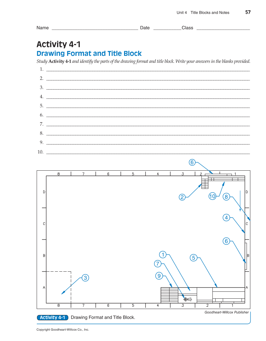 Unit 4 Title Blocks and Notes 57 Copyright Goodheart-Willcox Co., Inc. Name __________________________________ Date ___________Class _____________________ Activity 4-1 Drawing Format and Title Block Study Activity 4-1 and identify the parts of the drawing format and title block. Write your answers in the blanks provided. 1. ____________________________________________________________________________________ 2. ____________________________________________________________________________________ 3. ____________________________________________________________________________________ 4. ____________________________________________________________________________________ 5. ____________________________________________________________________________________ 6. ____________________________________________________________________________________ 7. ____________________________________________________________________________________ 8. ____________________________________________________________________________________ 9. ____________________________________________________________________________________ 10. ____________________________________________________________________________________ Goodheart-Willcox Publisher Drawing Format and Title Block. Activity 4-1 2 6 10 5 1 7 9 8 6 4 3