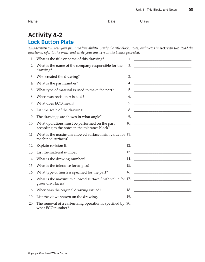 Unit 4 Title Blocks and Notes 59 Copyright Goodheart-Willcox Co., Inc. Name __________________________________ Date ___________Class _____________________ Activity 4-2 Lock Button Plate This activity will test your print reading ability. Study the title block, notes, and views in Activity 4-2. Read the questions, refer to the print, and write your answers in the blanks provided. 1. What is the title or name of this drawing? 2. What is the name of the company responsible for the drawing? 3. Who created the drawing? 4. What is the part number? 5. What type of material is used to make the part? 6. When was revision A issued? 7. What does ECO mean? 8. List the scale of the drawing. 9. The drawings are shown in what angle? 10. What operations must be performed on the part according to the notes in the tolerance block? 11. What is the maximum allowed surface fi nish value for machined surfaces? 12. Explain revision B. 13. List the material number. 14. What is the drawing number? 15. What is the tolerance for angles? 16. What type of fi nish is specifi ed for the part? 17. What is the maximum allowed surface fi nish value for ground surfaces? 18. When was the original drawing issued? 19. List the views shown on the drawing. 20. The removal of a carburizing operation is specifi ed by what ECO number? 1. ____________________________ 2. ____________________________ 3. ____________________________ 4. ____________________________ 5. ____________________________ 6. ____________________________ 7. ____________________________ 8. ____________________________ 9. ____________________________ 10. ____________________________ 11. ____________________________ 12. ____________________________ 13. ____________________________ 14. ____________________________ 15. ____________________________ 16. ____________________________ 17. ____________________________ 18. ____________________________ 19. ____________________________ 20. ____________________________