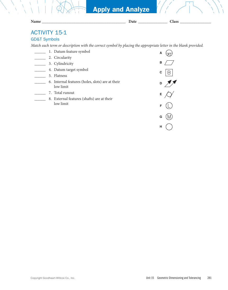 Unit 15 Geometric Dimensioning and Tolerancing 281 Copyright Goodheart-Willcox Co., Inc. Name _______________________________________________ Date _ ________________ Class __________________ ACTIVITY 15-1 GD&T Symbols Match each term or description with the correct symbol by placing the appropriate letter in the blank provided. ______ 1. Datum feature symbol ______ 2. Circularity ______ 3. Cylindricity ______ 4. Datum target symbol ______ 5. Flatness ______ 6. Internal features (holes, slots) are at their low limit ______ 7. Total runout ______ 8. External features (shafts) are at their low limit Apply and Analyze A B C D E F G H