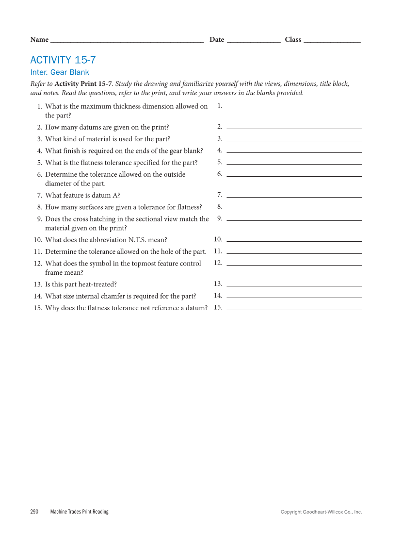 290 Machine Trades Print Reading Copyright Goodheart-Willcox Co., Inc. Name _______________________________________________ Date _ ________________ Class __________________ ACTIVITY 15-7 Inter. Gear Blank Refer to Activity Print 15‑7. Study the drawing and familiarize yourself with the views, dimensions, title block, and notes. Read the questions, refer to the print, and write your answers in the blanks provided. 1. What is the maximum thickness dimension allowed on the part? 2. How many datums are given on the print? 3. What kind of material is used for the part? 4. What finish is required on the ends of the gear blank? 5. What is the flatness tolerance specified for the part? 6. Determine the tolerance allowed on the outside diameter of the part. 7. What feature is datum A? 8. How many surfaces are given a tolerance for flatness? 9. Does the cross hatching in the sectional view match the material given on the print? 10. What does the abbreviation N.T.S. mean? 11. Determine the tolerance allowed on the hole of the part. 12. What does the symbol in the topmost feature control frame mean? 13. Is this part heat-treated? 14. What size internal chamfer is required for the part? 15. Why does the flatness tolerance not reference a datum? 1. 2. 3. 4. 5. 6. 7. 8. 9. 10. 11. 12. 13. 14. 15.
