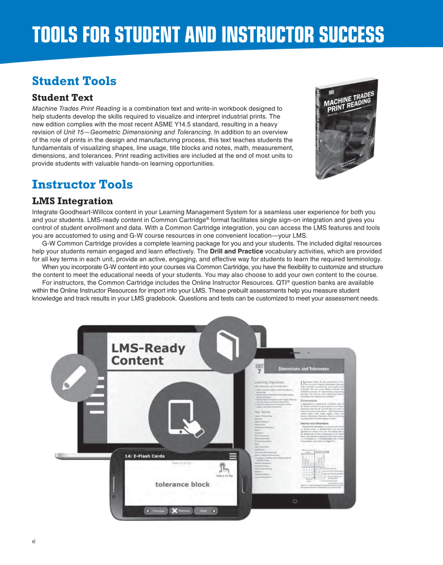 Student Tools Student Text Machine Trades Print Reading is a combination text and write-in workbook designed to help students develop the skills required to visualize and interpret industrial prints. The new edition complies with the most recent ASME Y14.5 standard, resulting in a heavy revision of Unit 15—Geometric Dimensioning and Tolerancing. In addition to an overview of the role of prints in the design and manufacturing process, this text teaches students the fundamentals of visualizing shapes, line usage, title blocks and notes, math, measurement, dimensions, and tolerances. Print reading activities are included at the end of most units to provide students with valuable hands-on learning opportunities. Instructor Tools LMS Integration Integrate Goodheart-Willcox content in your Learning Management System for a seamless user experience for both you and your students. LMS-ready content in Common Cartridge® format facilitates single sign-on integration and gives you control of student enrollment and data. With a Common Cartridge integration, you can access the LMS features and tools you are accustomed to using and G-W course resources in one convenient location—your LMS. G-W Common Cartridge provides a complete learning package for you and your students. The included digital resources help your students remain engaged and learn effectively. The Drill and Practice vocabulary activities, which are provided for all key terms in each unit, provide an active, engaging, and effective way for students to learn the required terminology. When you incorporate G-W content into your courses via Common Cartridge, you have the flexibility to customize and structure the content to meet the educational needs of your students. You may also choose to add your own content to the course. For instructors, the Common Cartridge includes the Online Instructor Resources. QTI® question banks are available within the Online Instructor Resources for import into your LMS. These prebuilt assessments help you measure student knowledge and track results in your LMS gradebook. Questions and tests can be customized to meet your assessment needs. TOOLS FOR STUDENT AND INSTRUCTOR SUCCESS vi