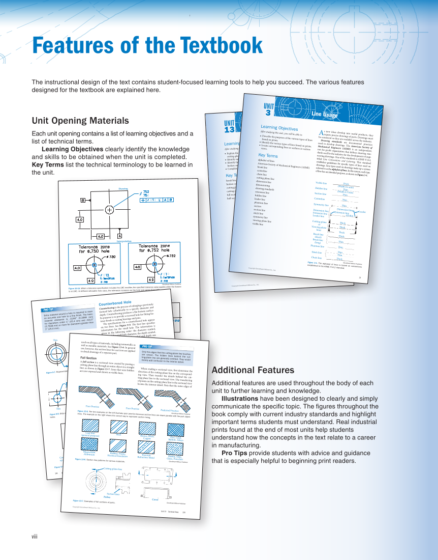 viii The instructional design of the text contains student-focused learning tools to help you succeed. The various features designed for the textbook are explained here. Features of the Textbook Copyright Goodheart-Willcox Co., Inc. 223 Sectional Views UNIT 13 Learning Objectives After studying this unit, you will be able to: ■ Explain the terms sectional view, cutting plane, and cutting-plane line. ■Identify various patterns of section lines. ■Identify full, offset, half, revolved, removed, and broken-out sections. ■Complete sketches of sectional views. Key Terms break line broken-out section cutting plane cutting-plane line full section half section offset section removed section revolved section section line sectional view A sectional view is a view that shows how an object would appear if a portion were cut away by an imaginary plane to reveal the interior details. The exposed (cut) surface is emphasized by the use of sec- tion lines. See Figure 13‑1. Working with Sectional Views Using sectional views is an effective way to show inte- rior features that would be complicated or confus- ing if described entirely by hidden lines. On a print, a sectional view may serve as one of the principal views—front, top, or right side—or it can be used as an additional view. A sectional view is developed by first passing a cutting plane through the part. A cutting plane is an imaginary plane that divides an object to produce a sectional view. Then, the section of the part nearest the viewer is removed, thereby revealing a direct and clear view of the interior shape. See Figureline 13‑1. Cutting-Plane Line The location of the imaginary cutting plane is indi-, cated by a heavy line called a cutting-plane line Cutting plane Goodheart-Willcox PublisherGoodheart-Willcox Figure 13-1. A sectional view showing how an imaginary cut- ting plane is used to cut away a portion of a part to reveal interior features. In this example, the cutting plane is located at the center of the part and the front half is cut away. Copyright Goodheart-Willcox Co., Inc. 23 Line Usage UNIT 3 Learning Objectives Aft er studying this unit, you will be able to: ■ Describe the purposes of the various types of lines found on prints. ■Identify the various types of lines found on prints. ■Locate corresponding lines or surfaces in various views. Key Terms alphabet of lines American Society of Mechanical Engineers (ASME) break line centerline chain line cutting-plane line dimension line dimensioning drawing standards extension line hidden line leader line phantom line section section line stitch line symmetry line viewing-plane line visible line As new ideas develop into useful products, they require precise drawings of parts. Drawings must be consistent so they are readable across the industry. Drawing standards are documented practices used to develop drawings. The American Society of Mechanical Engineers (ASME) is an independent, not-for-profit organization that defines drawing stan- dards used by the industry for the development of engi - neering drawings. One of the standards is ASME Y14.2, titled Line Conventions and Lettering. This standard establishes guidelines for specific types of lines used on drawings. Line types used on drawings make up a system referred to as the alphabet of lines.Inthissystem,eachtypein3‑1.eFigur of line has an intended purpose, as shown Visible line Thick Thick Thick Thick Thick Thick Thin Thin Thin Thin Thin Thin Thin Thin (Width 0.6 mm) (Width 0.3 mm) All thin Leader Dimension line Extension line Hidden line Section Centerline Symmetry line Dimension line Extension line Leader line Cutting-plane or Viewing-plane lines Break line (long) Break line (short) Stitch line Phantom line Chain line Publisher Figure 3-1. The alphabet of lines is based on conventions established in the ASME Y14.2 standard. Unit Opening Materials Each unit opening contains a list of learning objectives and a list of technical terms. Learning Objectives clearly identify the knowledge and skills to be obtained when the unit is completed. Key Terms list the technical terminology to be learned in the unit. Additional Features Additional features are used throughout the body of each unit to further learning and knowledge. Illustrations have been designed to clearly and simply communicate the specific topic. The figures throughout the book comply with current industry standards and highlight important terms students must understand. Real industrial prints found at the end of most units help students understand how the concepts in the text relate to a career in manufacturing. Pro Tips provide students with advice and guidance that is especially helpful to beginning print readers. 268 Machine Trades Print Reading Copyright Goodheart-Willcox Co., Inc.touchescut-the Drawing Interpretation Goodheart-Willcox Publisher Figure 15-15. When a tolerance specification includes the LMC modifier, the specified tolerance value applies when the feature is at LMC. At different allowable hole sizes, the tolerance increases as the hole size varies from LMC. Ø .750–.752 located tolerancepreviously.010a zone within Drawing Interpretation Goodheart-Willcox Publisher Figure 15-16. When a tolerance is specified at RFS, the specified tolerance value remains constant and applies regardless of the actual size of the feature. 140 Machine Trades Print Reading Copyright Goodheart-Willcox Co., Inc. Extra material around a hole is required to ream an accurate size hole to a fine finish. The basic material allowance is .0156″mm) (0.3968 mm) for diameters under 1″ (25.4 and .0313″ (0.7938 mm) or more for diameters greater than 1″ (25.4 mm). PRO TIP Counterbored Holeenlarging Counterboring is the process of formed hole cylindrically to a specific diameter and depth. Counterboring produces a flat bottom surface. Its purpose is to provide a recessed hole for fitting fas- tener heads or seating bearings and pins. The specifications for a 