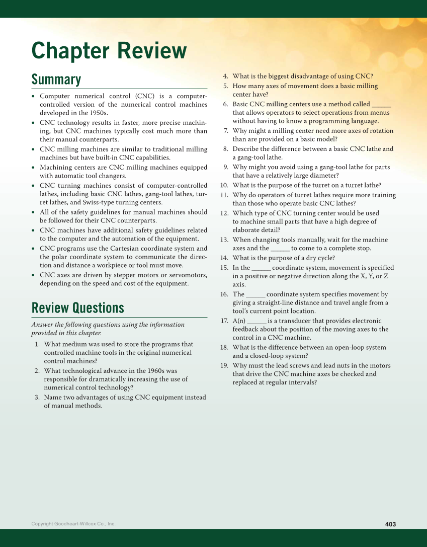 403 Copyright Goodheart-Willcox Co., Inc. Chapter Review Summary • Computer numerical control (CNC) is a computer- controlled version of the numerical control machines developed in the 1950s. • CNC technology results in faster, more precise machin- ing, but CNC machines typically cost much more than their manual counterparts. • CNC milling machines are similar to traditional milling machines but have built-in CNC capabilities. • Machining centers are CNC milling machines equipped with automatic tool changers. • CNC turning machines consist of computer-controlled lathes, including basic CNC lathes, gang-tool lathes, tur- ret lathes, and Swiss-type turning centers. • All of the safety guidelines for manual machines should be followed for their CNC counterparts. • CNC machines have additional safety guidelines related to the computer and the automation of the equipment. • CNC programs use the Cartesian coordinate system and the polar coordinate system to communicate the direc- tion and distance a workpiece or tool must move. • CNC axes are driven by stepper motors or servomotors, depending on the speed and cost of the equipment. Review Questions Answer the following questions using the information provided in this chapter. 1. What medium was used to store the programs that controlled machine tools in the original numerical control machines? 2. What technological advance in the 1960s was responsible for dramatically increasing the use of numerical control technology? 3. Name two advantages of using CNC equipment instead of manual methods. 4. What is the biggest disadvantage of using CNC? 5. How many axes of movement does a basic milling center have? 6. Basic CNC milling centers use a method called ______ that allows operators to select operations from menus without having to know a programming language. 7. Why might a milling center need more axes of rotation than are provided on a basic model? 8. Describe the difference between a basic CNC lathe and a gang-tool lathe. 9. Why might you avoid using a gang-tool lathe for parts that have a relatively large diameter? 10. What is the purpose of the turret on a turret lathe? 11. Why do operators of turret lathes require more training than those who operate basic CNC lathes? 12. Which type of CNC turning center would be used to machine small parts that have a high degree of elaborate detail? 13. When changing tools manually, wait for the machine axes and the ______ to come to a complete stop. 14. What is the purpose of a dry cycle? 15. In the ______ coordinate system, movement is specified in a positive or negative direction along the X, Y, or Z axis. 16. The ______ coordinate system specifies movement by giving a straight-line distance and travel angle from a tool’s current point location. 17. A(n) ______ is a transducer that provides electronic feedback about the position of the moving axes to the control in a CNC machine. 18. What is the difference between an open-loop system and a closed-loop system? 19. Why must the lead screws and lead nuts in the motors that drive the CNC machine axes be checked and replaced at regular intervals?