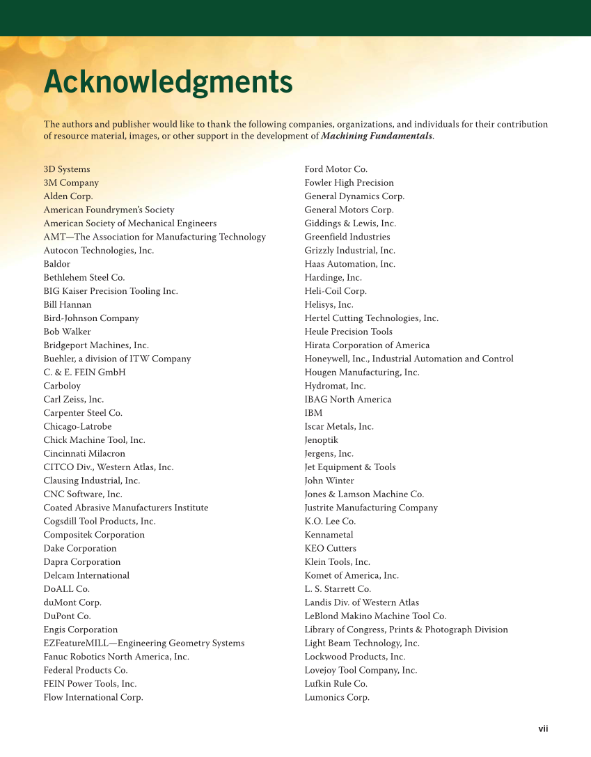 vii Acknowledgments The authors and publisher would like to thank the following companies, organizations, and individuals for their contribution of resource material, images, or other support in the development of Machining Fundamentals. 3D Systems 3M Company Alden Corp. American Foundrymen’s Society American Society of Mechanical Engineers AMT—The Association for Manufacturing Technology Autocon Technologies, Inc. Baldor Bethlehem Steel Co. BIG Kaiser Precision Tooling Inc. Bill Hannan Bird-Johnson Company Bob Walker Bridgeport Machines, Inc. Buehler, a division of ITW Company C. & E. FEIN GmbH Carboloy Carl Zeiss, Inc. Carpenter Steel Co. Chicago-Latrobe Chick Machine Tool, Inc. Cincinnati Milacron CITCO Div., Western Atlas, Inc. Clausing Industrial, Inc. CNC Software, Inc. Coated Abrasive Manufacturers Institute Cogsdill Tool Products, Inc. Compositek Corporation Dake Corporation Dapra Corporation Delcam International DoALL Co. duMont Corp. DuPont Co. Engis Corporation EZFeatureMILL—Engineering Geometry Systems Fanuc Robotics North America, Inc. Federal Products Co. FEIN Power Tools, Inc. Flow International Corp. Ford Motor Co. Fowler High Precision General Dynamics Corp. General Motors Corp. Giddings & Lewis, Inc. Greenfield Industries Grizzly Industrial, Inc. Haas Automation, Inc. Hardinge, Inc. Heli-Coil Corp. Helisys, Inc. Hertel Cutting Technologies, Inc. Heule Precision Tools Hirata Corporation of America Honeywell, Inc., Industrial Automation and Control Hougen Manufacturing, Inc. Hydromat, Inc. IBAG North America IBM Iscar Metals, Inc. Jenoptik Jergens, Inc. Jet Equipment & Tools John Winter Jones & Lamson Machine Co. Justrite Manufacturing Company K.O. Lee Co. Kennametal KEO Cutters Klein Tools, Inc. Komet of America, Inc. L. S. Starrett Co. Landis Div. of Western Atlas LeBlond Makino Machine Tool Co. Library of Congress, Prints & Photograph Division Light Beam Technology, Inc. Lockwood Products, Inc. Lovejoy Tool Company, Inc. Lufkin Rule Co. Lumonics Corp.