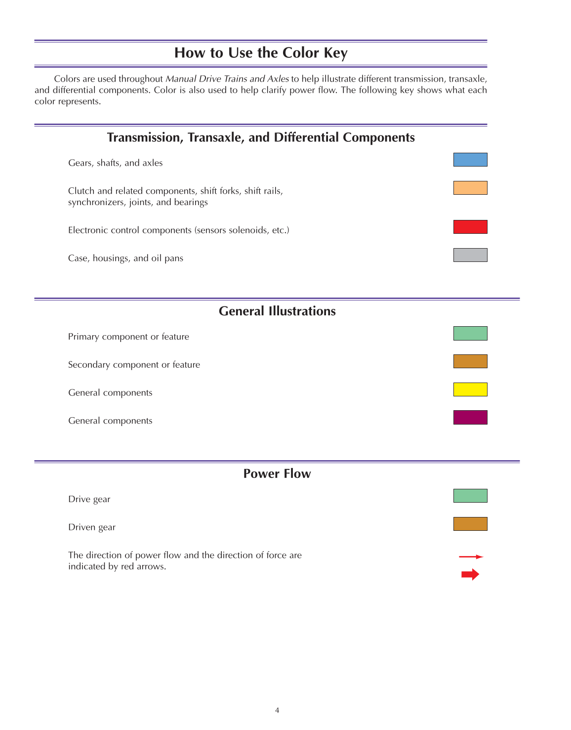 Colors are used throughout Manual Drive Trains and Axles to help illustrate different transmission, transaxle,