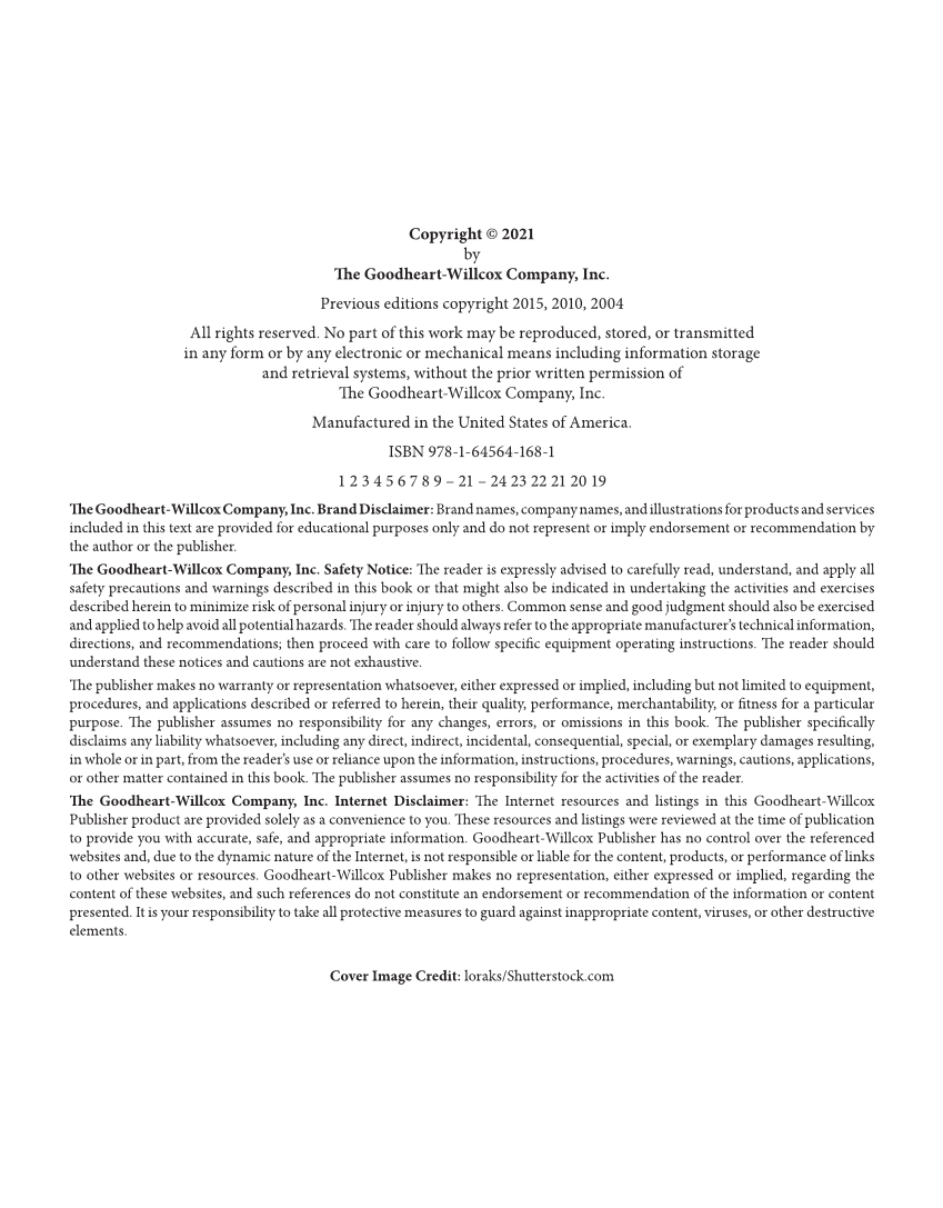 Copyright © 2021 by Th e Goodheart-Willcox Company, Inc. Previous editions copyright 2015, 2010, 2004 All rights reserved. No part of this work may be reproduced, stored, or transmitted in any form or by any electronic or mechanical means including information storage and retrieval systems, without the prior written permission of Th e Goodheart-Willcox Company, Inc. Manufactured in the United States of America. ISBN 978-1-64564-168-1 1 2 3 4 5 6 7 8 9 – 21 – 24 23 22 21 20 19 Th e Goodheart-Willcox Company, Inc. Brand Disclaimer: Brand names, company names, and illustrations for products and services included in this text are provided for educational purposes only and do not represent or imply endorsement or recommendation by the author or the publisher. Th e Goodheart-Willcox Company, Inc. Safety Notice: Th e reader is expressly advised to carefully read, understand, and apply all safety precautions and warnings described in this book or that might also be indicated in undertaking the activities and exercises described herein to minimize risk of personal injury or injury to others. Common sense and good judgment should also be exercised and applied to help avoid all potential hazards. Th e reader should always refer to the appropriate manufacturer’s technical information, directions, and recommendations then proceed with care to follow specific equipment operating instructions. Th e reader should understand these notices and cautions are not exhaustive. Th e publisher makes no warranty or representation whatsoever, either expressed or implied, including but not limited to equipment, procedures, and applications described or referred to herein, their quality, performance, merchantability, or fi tness for a particular purpose. Th e publisher assumes no responsibility for any changes, errors, or omissions in this book. Th e publisher specifically disclaims any liability whatsoever, including any direct, indirect, incidental, consequential, special, or exemplary damages resulting, in whole or in part, from the reader’s use or reliance upon the information, instructions, procedures, warnings, cautions, applications, or other matter contained in this book. Th e publisher assumes no responsibility for the activities of the reader. Th e Goodheart-Willcox Company, Inc. Internet Disclaimer: Th e Internet resources and listings in this Goodheart-Willcox Publisher product are provided solely as a convenience to you. Th ese resources and listings were reviewed at the time of publication to provide you with accurate, safe, and appropriate information. Goodheart-Willcox Publisher has no control over the referenced websites and, due to the dynamic nature of the Internet, is not responsible or liable for the content, products, or performance of links to other websites or resources. Goodheart-Willcox Publisher makes no representation, either expressed or implied, regarding the content of these websites, and such references do not constitute an endorsement or recommendation of the information or content presented. It is your responsibility to take all protective measures to guard against inappropriate content, viruses, or other destructive elements. Cover Image Credit: loraks/Shutterstock.com