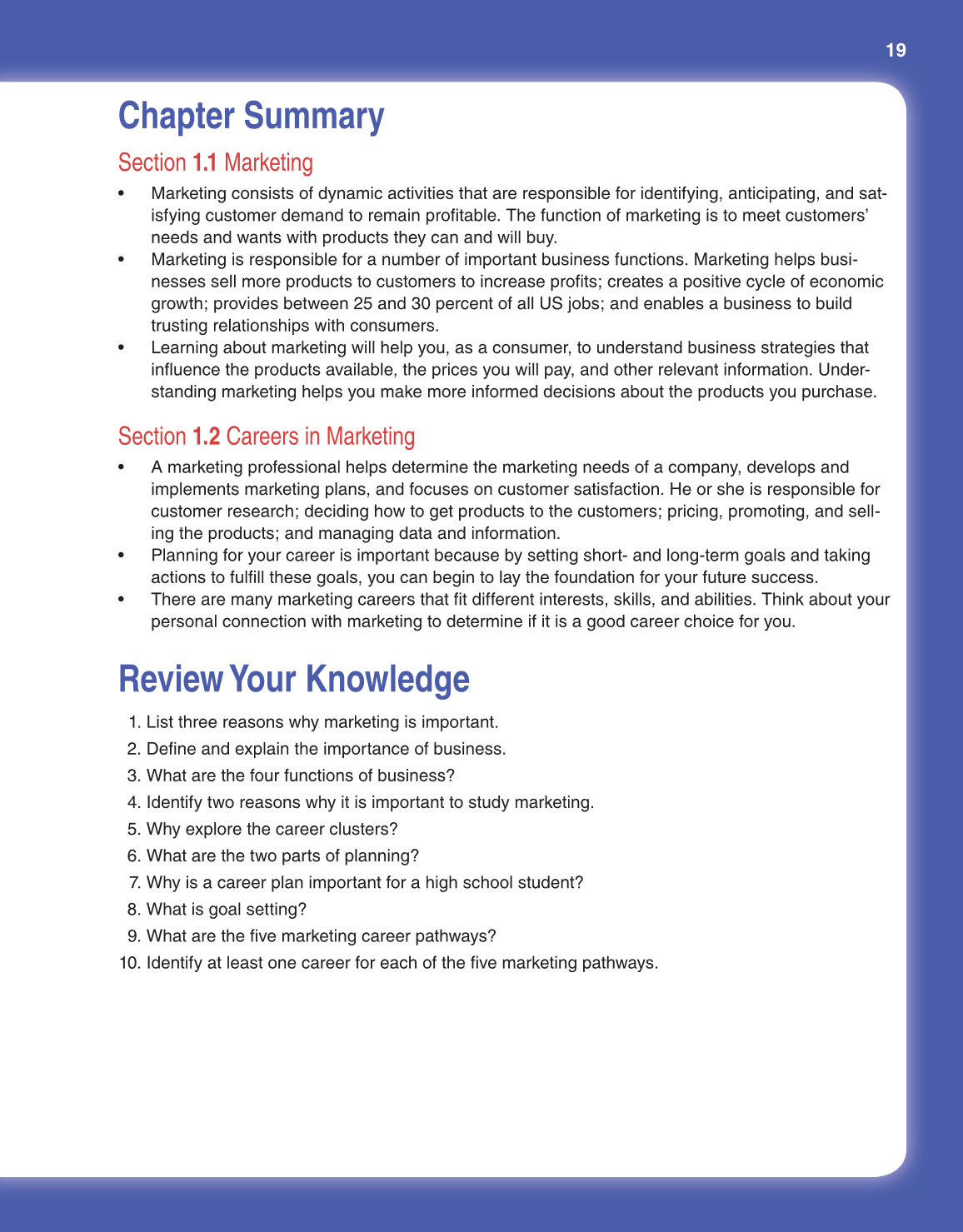 customer research; deciding how to get products to the customers; pricing, promoting, and sell-